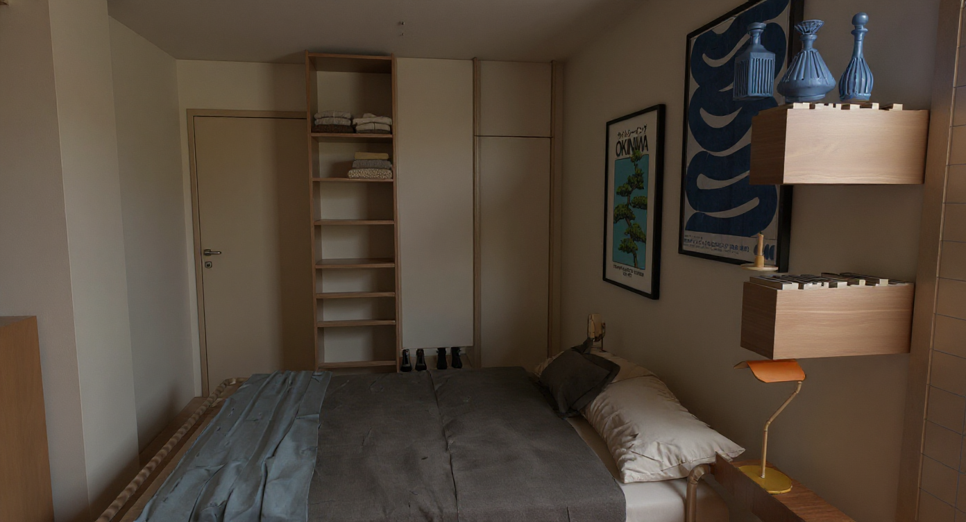zoom out change tree and make distance between house and tree remove planting and tree reflection from glass