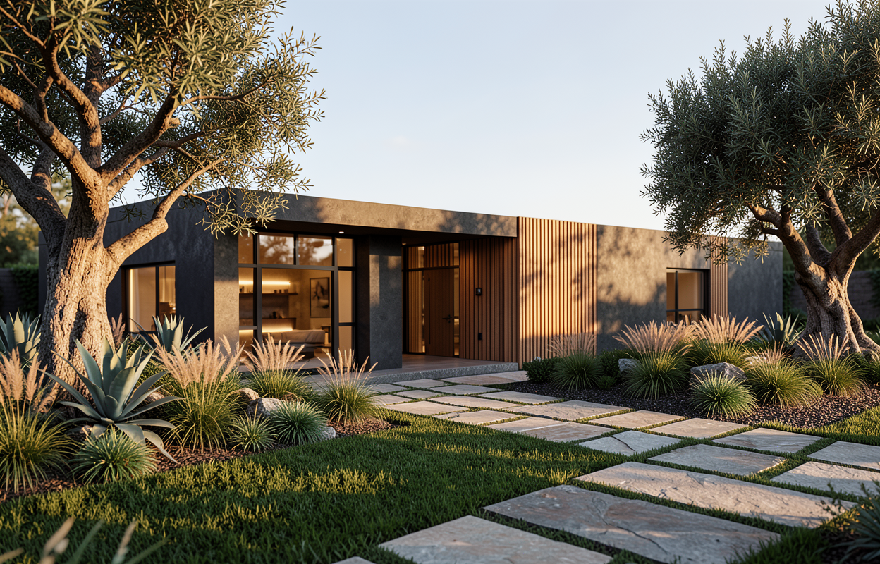 a photorealistic ultra high resolution photograph captured with the precise architectural geometry defined by the uploaded structural guide the view is a precise eye level flat lay perspective that perfectly matches the fixed boundaries of the building the specific window grids and central door assembly must be rendered exactly as positioned in image 2 png exterior walls are clad in matte finish dark charcoal concrete panels contrasted with vertical warm cedar wood slatting interior led lights glow warmly through the custom grid windows the surrounding yard is level green lawn bordered by natural flagstone pavers and layered garden featuring agave plants and feather reed grass photorealistic textures of wood grain concrete aggregate and plant biology are hyper detailed shallow depth of field focusing on the central entrance subtle natural background elements 8k ultra hd cinematic photography neutral color palette with warm wood accents
