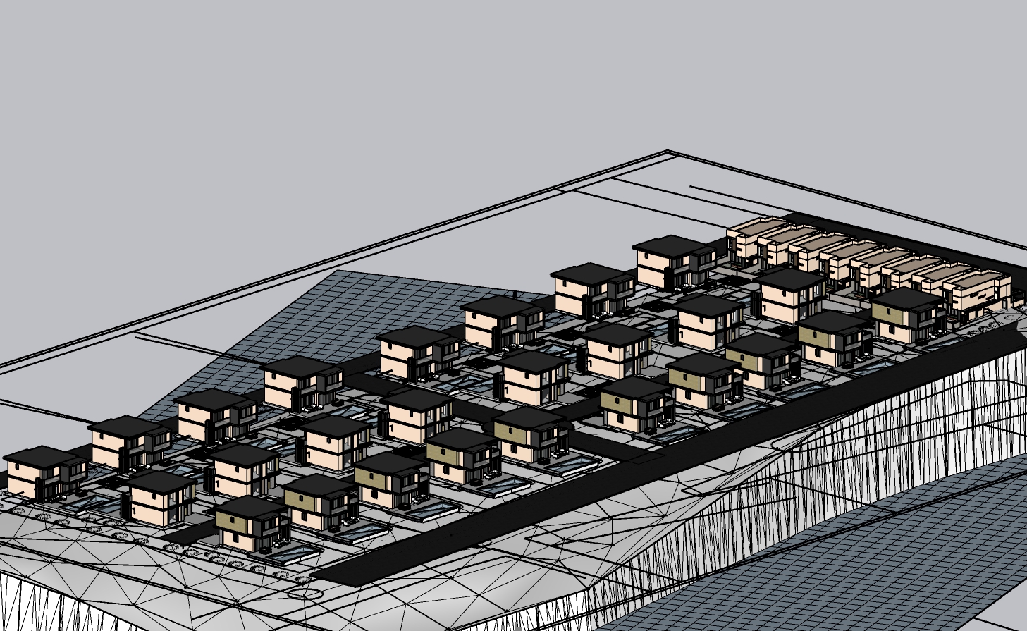 ultra photorealistic aerial architectural render of a modern villa masterplan strictly based on the provided input image critical preserve exactly exact number of villas exact positions spacing and orientations exact road layout and circulation exact site boundaries and geometry no additions no deletions no reinterpretation this is an image to image transformation the base plan must remain 100 identical architecture contemporary minimalist villas flat roofs clean volumes warm beige plaster natural travertine stone cladding matte black dark aluminum window frames large glass openings with subtle reflections realistic scale and proportions landscape mediterranean vegetation olive trees cypress low shrubs dry grass natural distribution avoid repetition layered planting foreground midground background depth terrain clearly visible sloped topography not flat approx 10m level difference across site villas stepping naturally with terrain soft terrain deformation erosion and color variation roads surfaces realistic asphalt roads with slight wear light stone pavements subtle curb details driveways clearly defined pools each villa has a private pool realistic water reflections slight ripples lighting very important golden hour sunset strong directional light long soft shadows warm highlights cool shadows cinematic contrast render style ultra realistic real estate marketing quality pbr materials physically correct textures global illumination ambient occlusion slight atmospheric haze for depth sharp but natural not overprocessed camera aerial 3 4 perspective slightly angled not top down wide lens but no distortion quality 8k resolution highly detailed cinematic composition