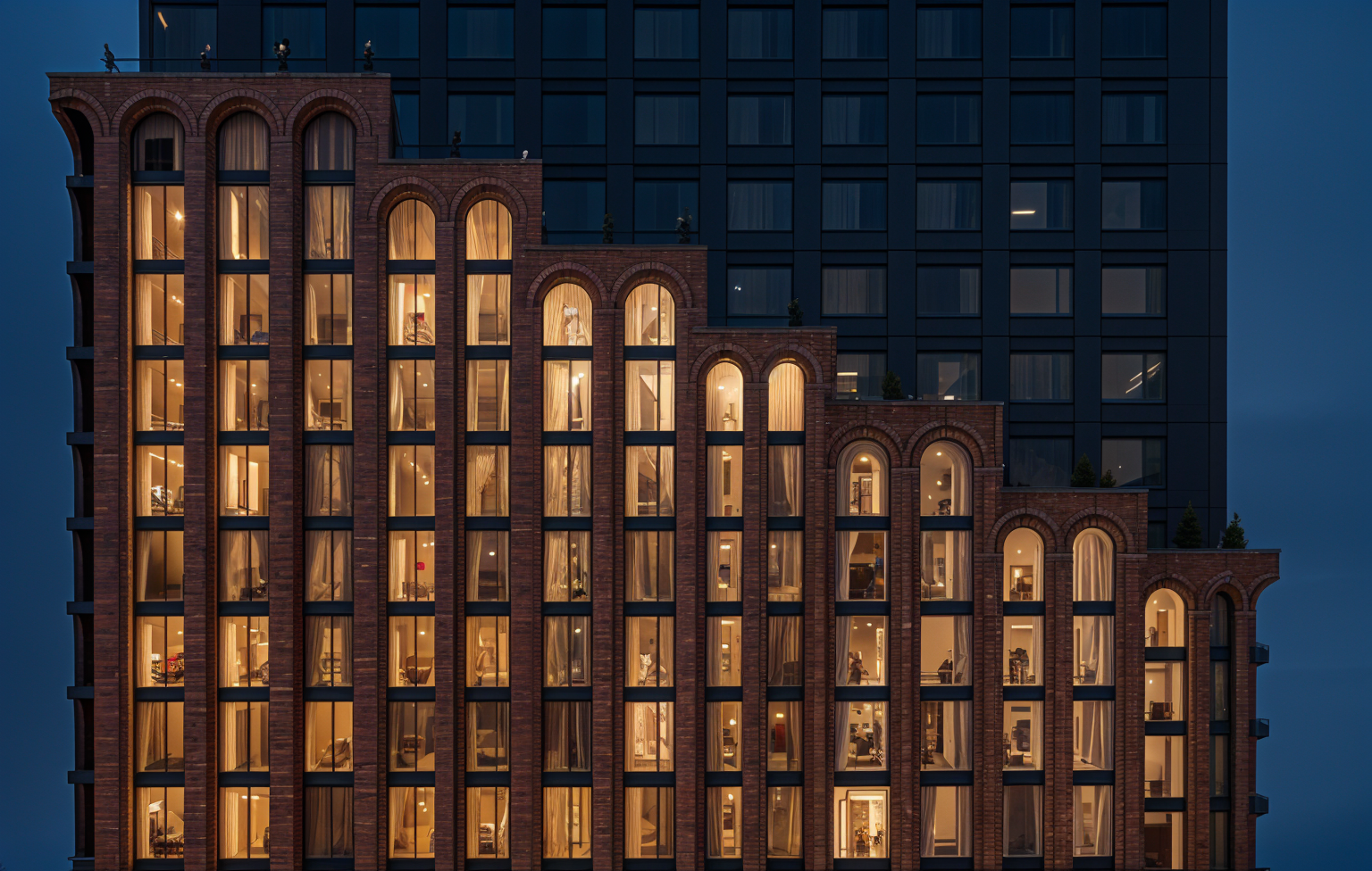 show a dark grey flat tile roof dark grey corbels and horizonal wood shutter suspended below the entry roofline 3 equal transom windows picture framed with 4 stucco banding and dark grey scored horizonal banded stucco below on each side of the home dark grey dappled paver sidewalk from entry doors sweeping to left side of home no garage doors tropical landscape with blue sky and fair weather clouds