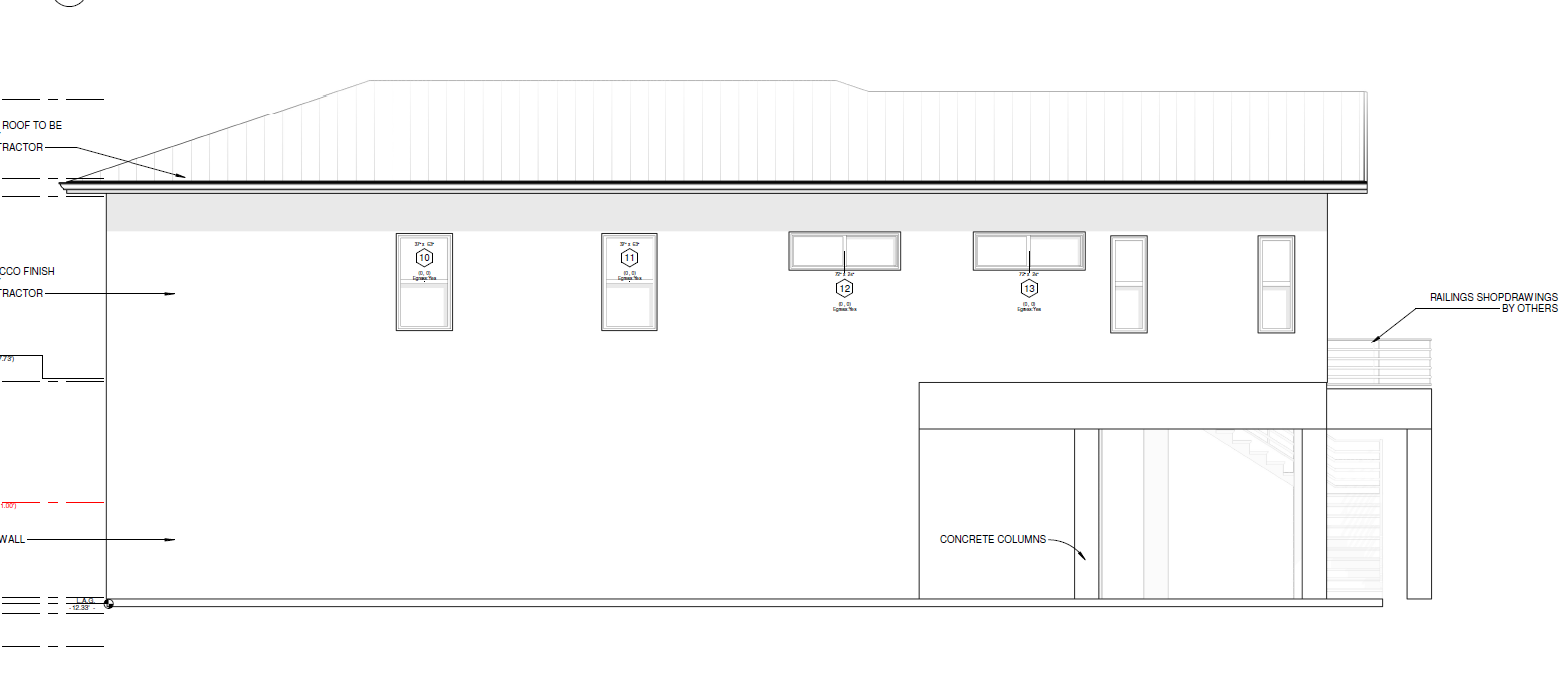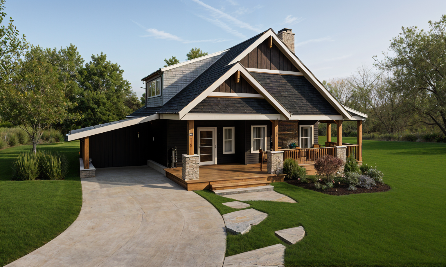 exterior shot render a modern two story building with a clean minimalist design the roof is a sleek charcoal gray with a subtle texture the walls are a soft warm white stucco finish large clear glass windows reflect sky blue the front facade features vertical wooden panels in light oak concrete columns are smooth and light gray the railing is an elegant brushed aluminum the atmosphere is contemporary and inviting with natural sunlight casting gentle shadows across the structure highlighting its architectural lines and clean design