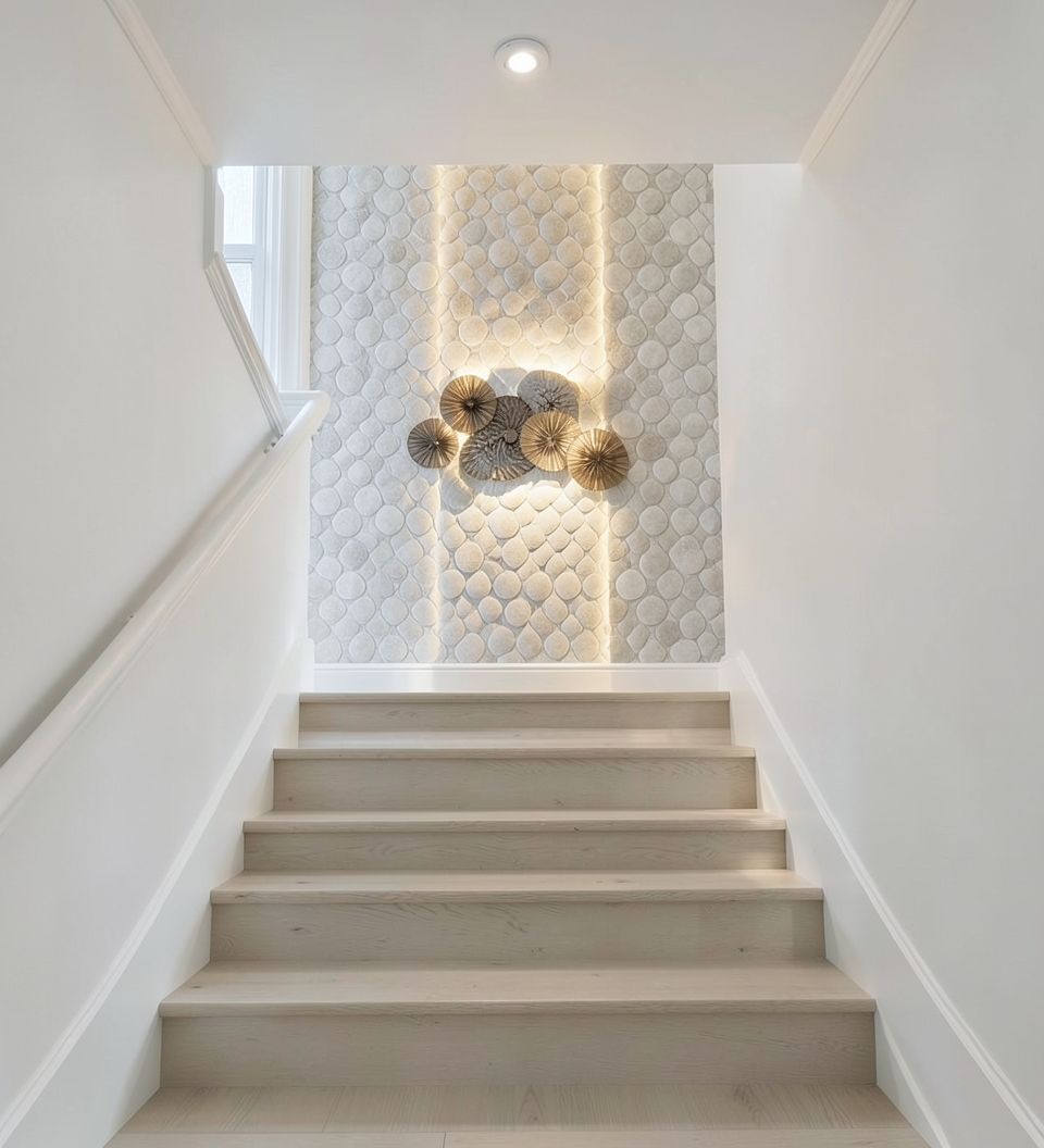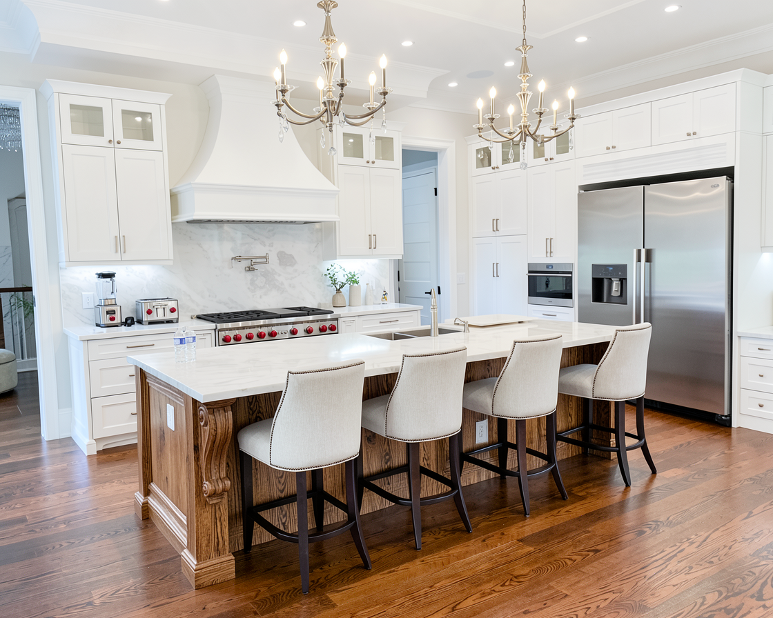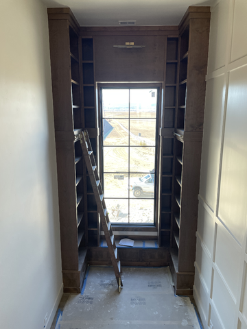 do not change the cabinets in any way preserve the exact cabinet colors materials finishes dimensions door and drawer styles hardware spacing alignment and all geometry exactly as shown do not alter the countertop shape backsplash appliances flooring lighting fixtures or wall structure only remove the construction materials clutter and mess from the scene clean the room and make it look finished and staged add a few simple tasteful home accessories appropriate for the style of the space but do not add or remove any furniture windows or architectural elements maintain the original lighting direction and realism enhance clarity and polish the photo while keeping the cabinetry and room design completely unchanged do not alter the lighting to keep the cabinet colors as they are in the image add new flooring turn on the light sconce with a picture below add a view out the window stage all of the shelves for a luxurious library
