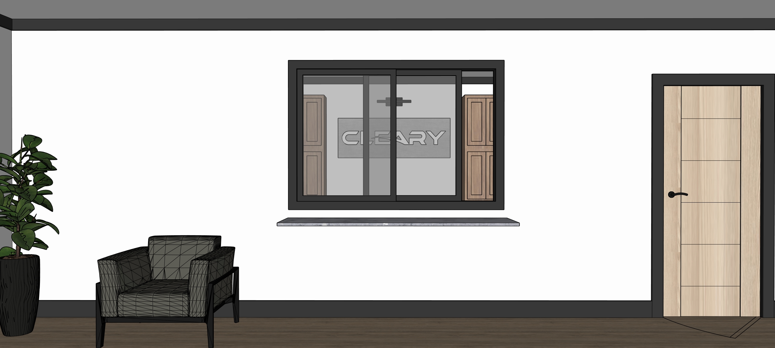 maintain design make realistic add vehicles in parking lot add office decor add people in room add ceiling can lighting receptionist behind sliding window