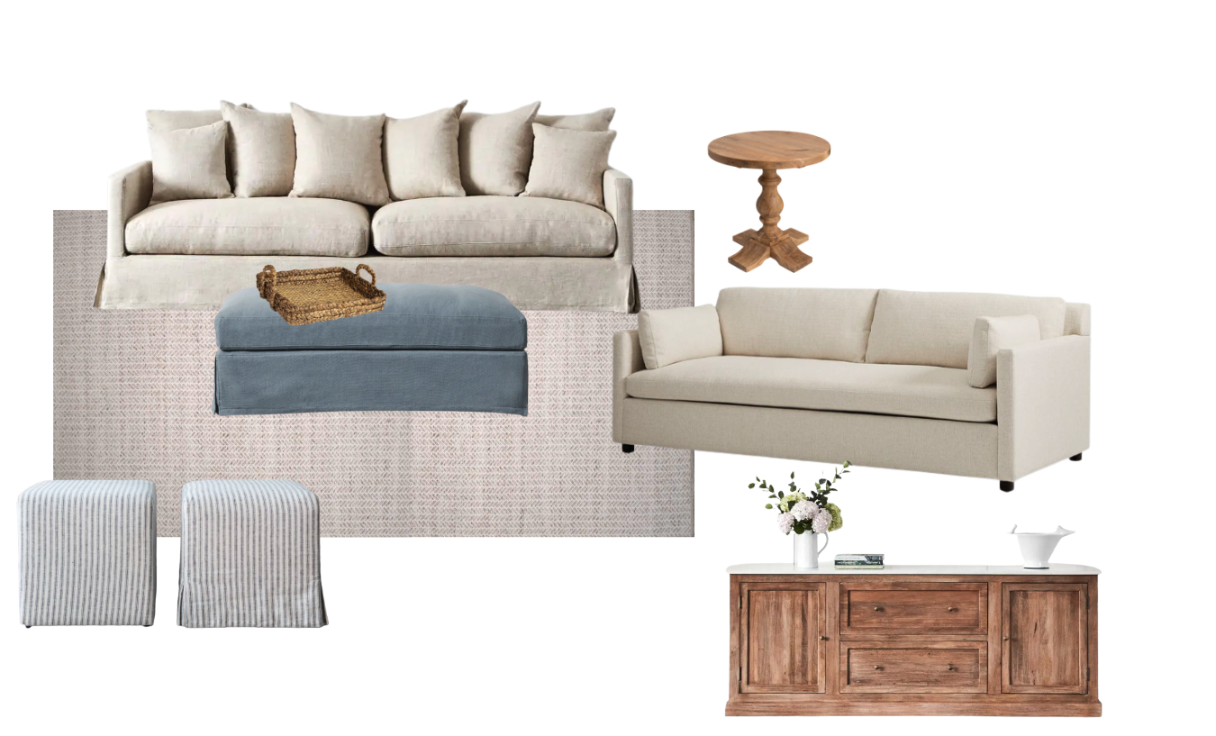 please use the furniture in this mood board to create an hamptons style living room walls should be a warm natural white but not yellow oak floorboards overall lighting should be natural daylight similar to what you would see in an interior design magazine