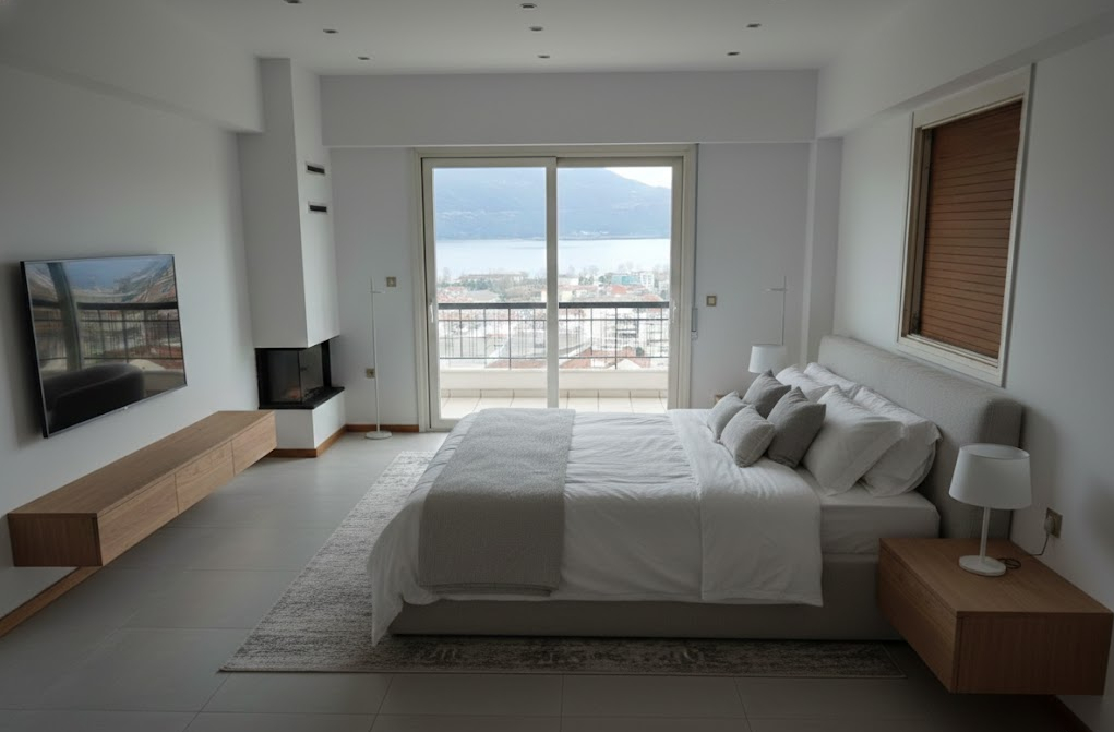 transform this room into a beautifully renovated living space with polished hardwood floors in a rich walnut brown freshly painted walls in soft ivory and large window frames in sleek black add modern minimalistic furniture in shades of charcoal and cream incorporate a cozy ambience with ambient lighting in warm golden hues and place vibrant green plants by the window for a touch of nature create an atmosphere of elegance and freshness with a hint of contemporary luxury