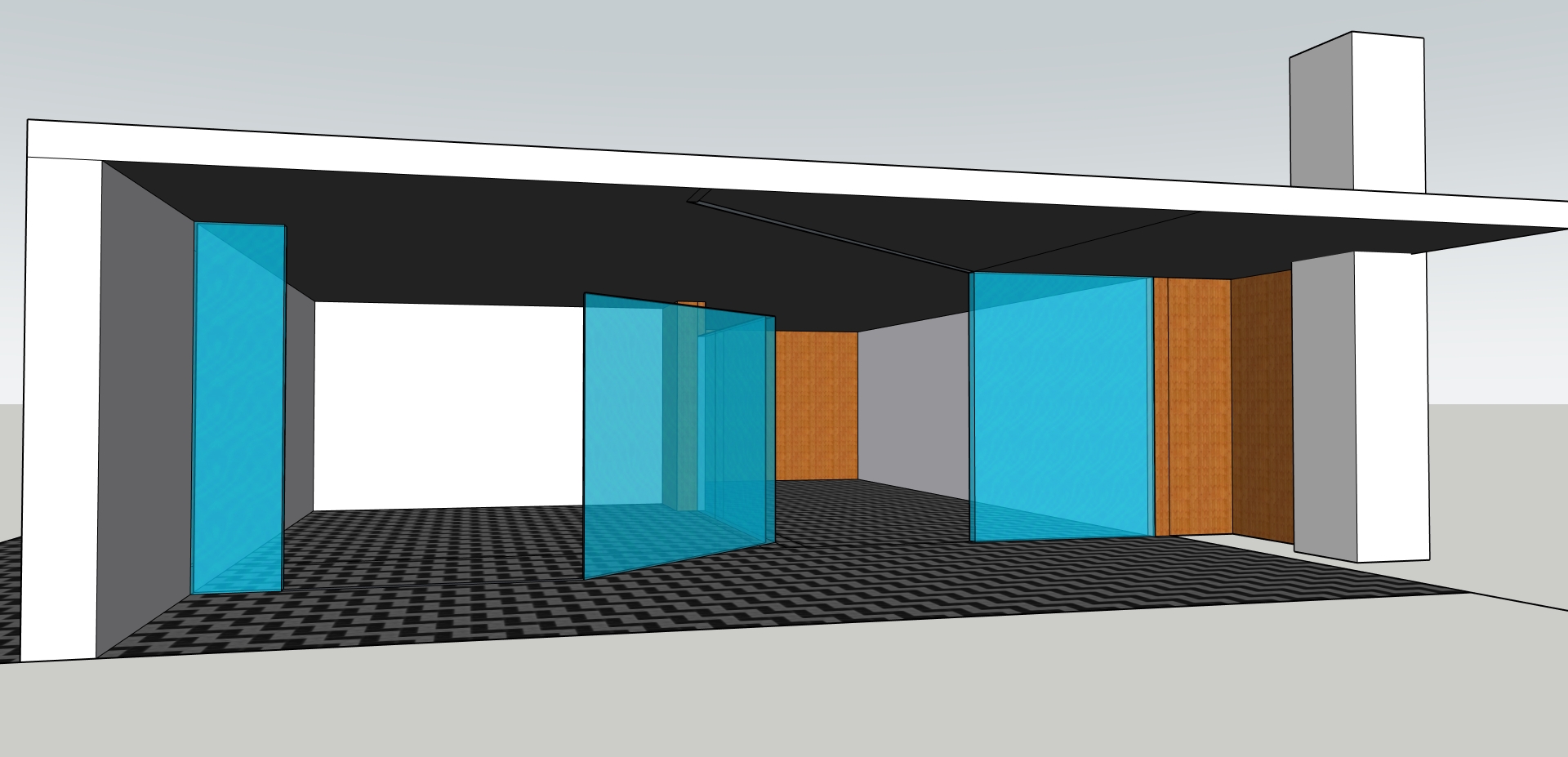 interior wtih multilple layered screen wall video displays staggered differnt sizes and lighting for personality portraits and stories and theatre row seating dark lighting enclosed glass room portable seating in screen area divided seating areas