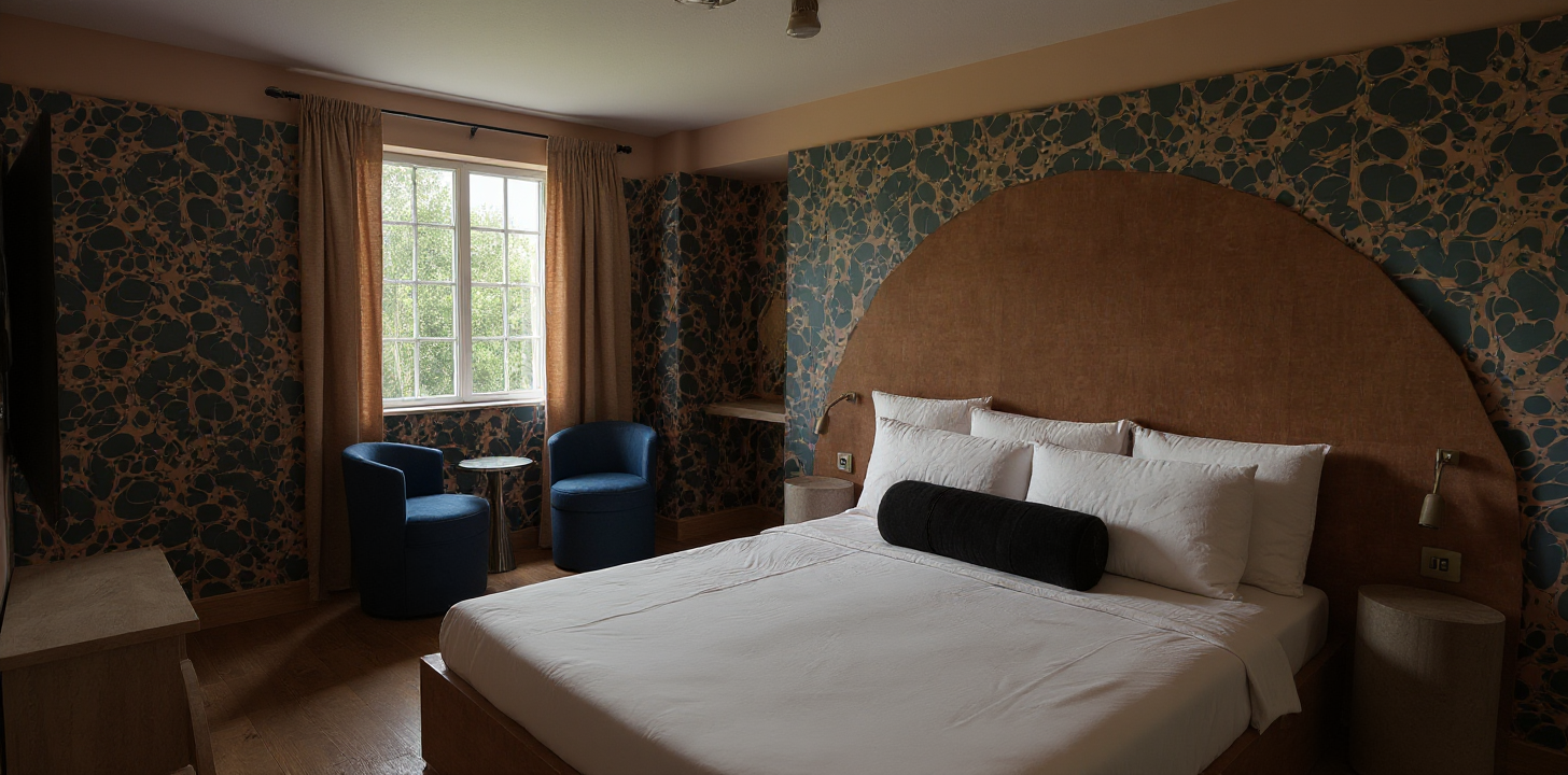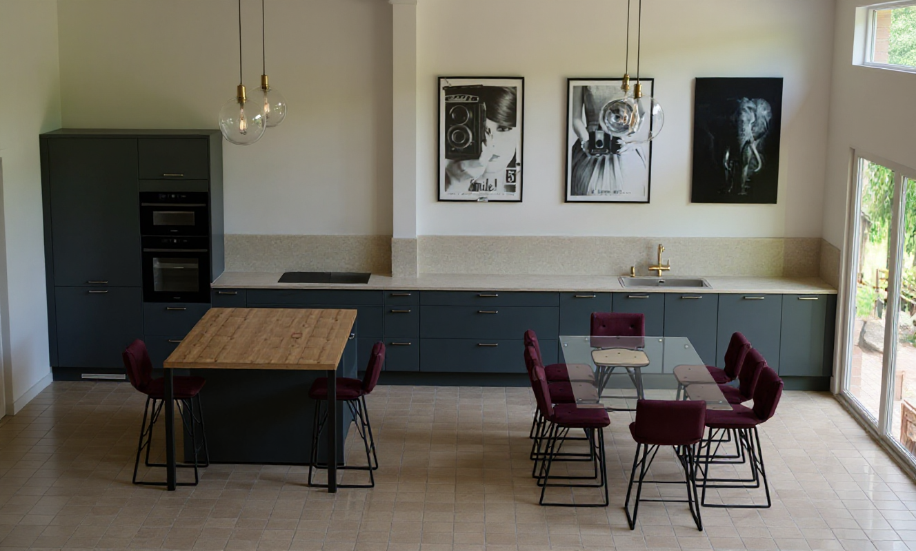 morning light coming in through the window on the right sliding pocket doors can be seen at the back of the room respect all the colors of the original sketch suppress the tv and the big sculpture in the background enlarge the carpet install a modern window in place of the current window with floor to ceiling california style blinds only paint the cupboard in the sale yellow than the wall leave the original pending lamps above the dining table there s a painting and not a window above the couch the couch is white pplease put back the mirror with the yellow wavy frame on the wall with the striped wallpaper there s a wall behind the the dining nook bench put the original carpet please and erase the green wall in the back enlarge a bit the carpet the painting on the wall is abstract and colorful