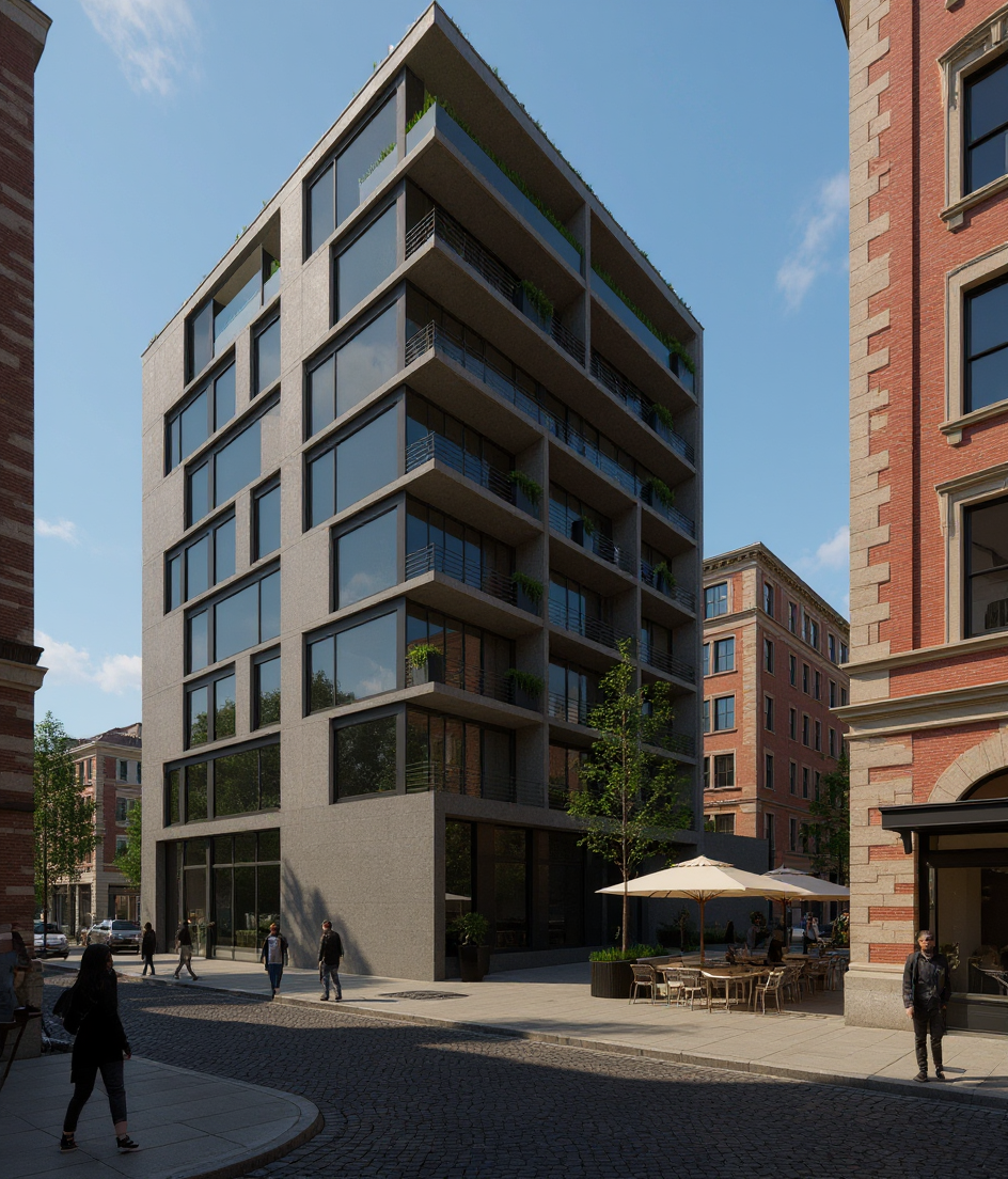 exterior shot exterior shot stunning urban street scene featuring a modern sleek apartment building the building has a minimalist gray facade accented by dark reflective glass windows vertical planters host lush greenery cascading softly from each balcony adjacent a classic brick building adds contrast with warm red and brown tones the street below is bustling with life people casually walking a tree providing fresh greenery and a cafe with beige umbrellas and seating the ground has a neatly paved sidewalk next to a subtle stone wall the atmosphere is vibrant and contemporary filled with bright natural daylight that casts gentle shadows suggesting a peaceful sunny afternoon in the city architecture the roof on balonies is architecture