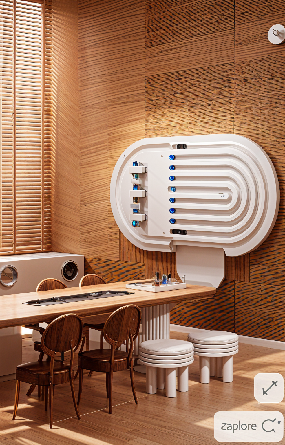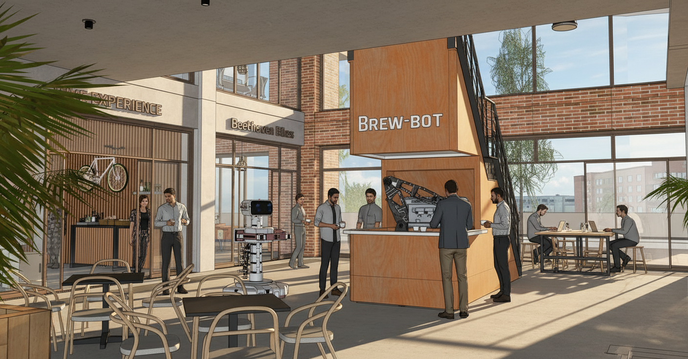 modernist interior shot modern coworking makerspace people working light colors robots wooden accents warm morning light ambience architecture