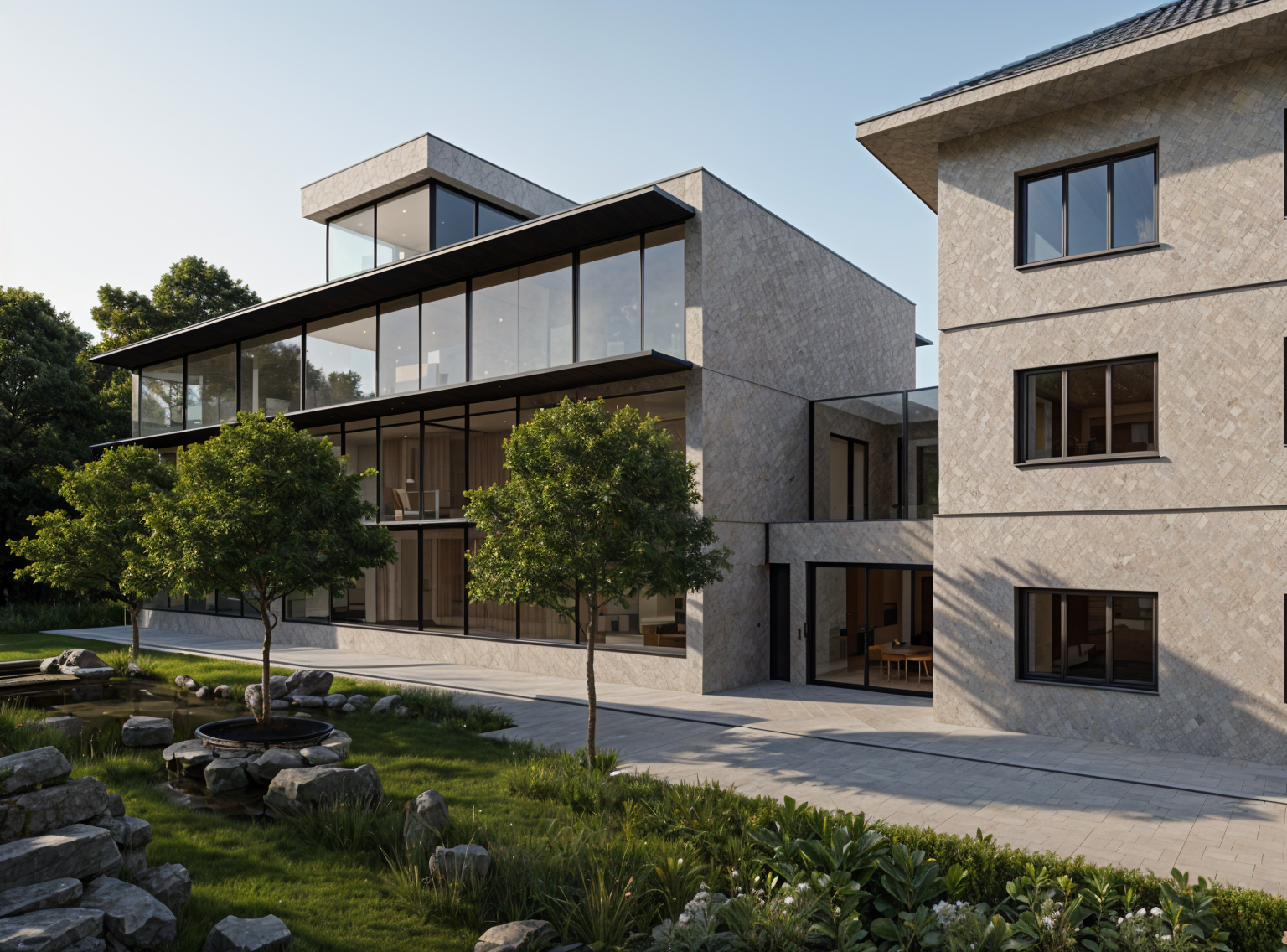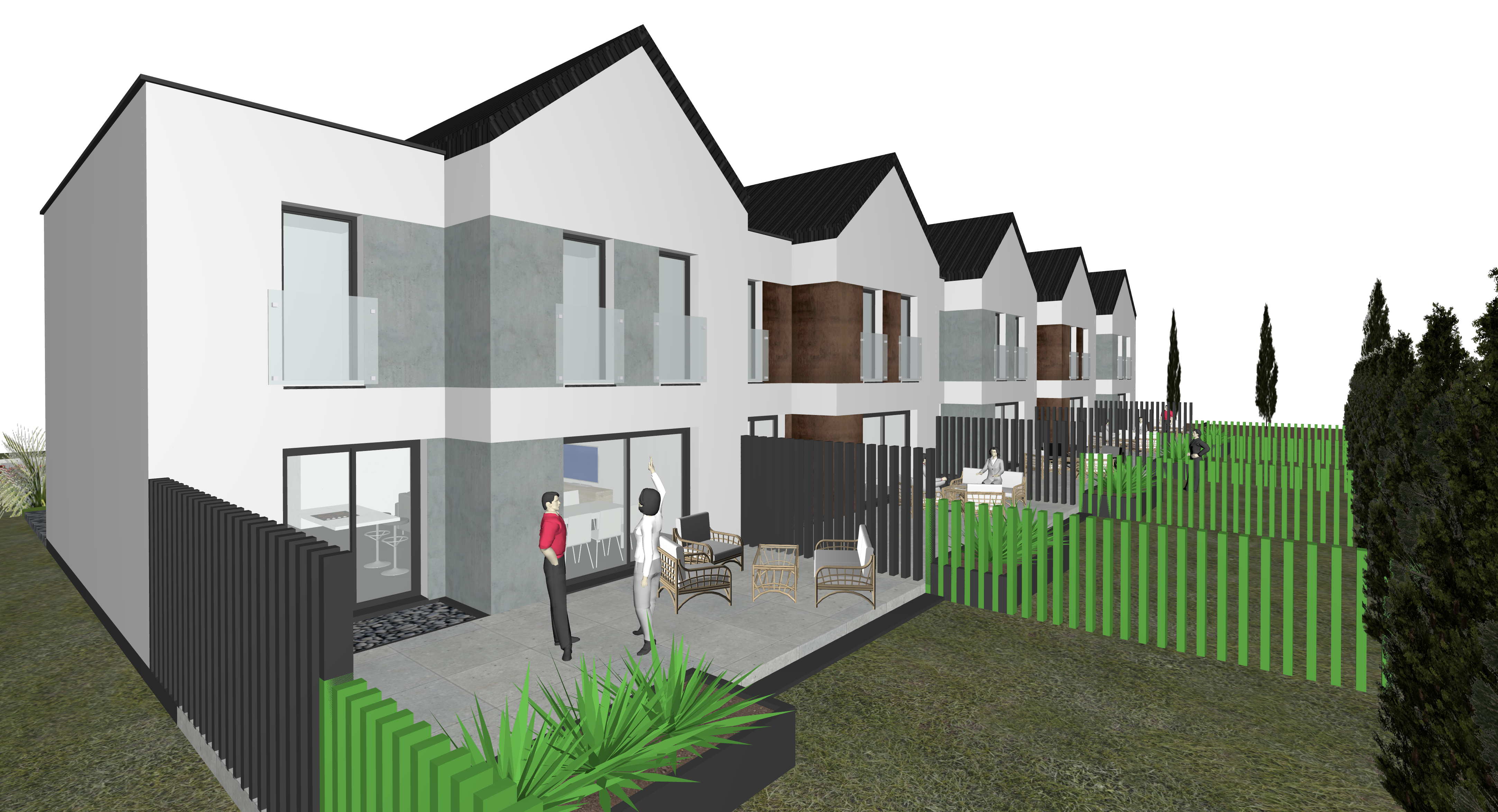 modern terraced house seamless sheet metal roof glass balustrades lots of greenness sunny day trees and meadow in the background