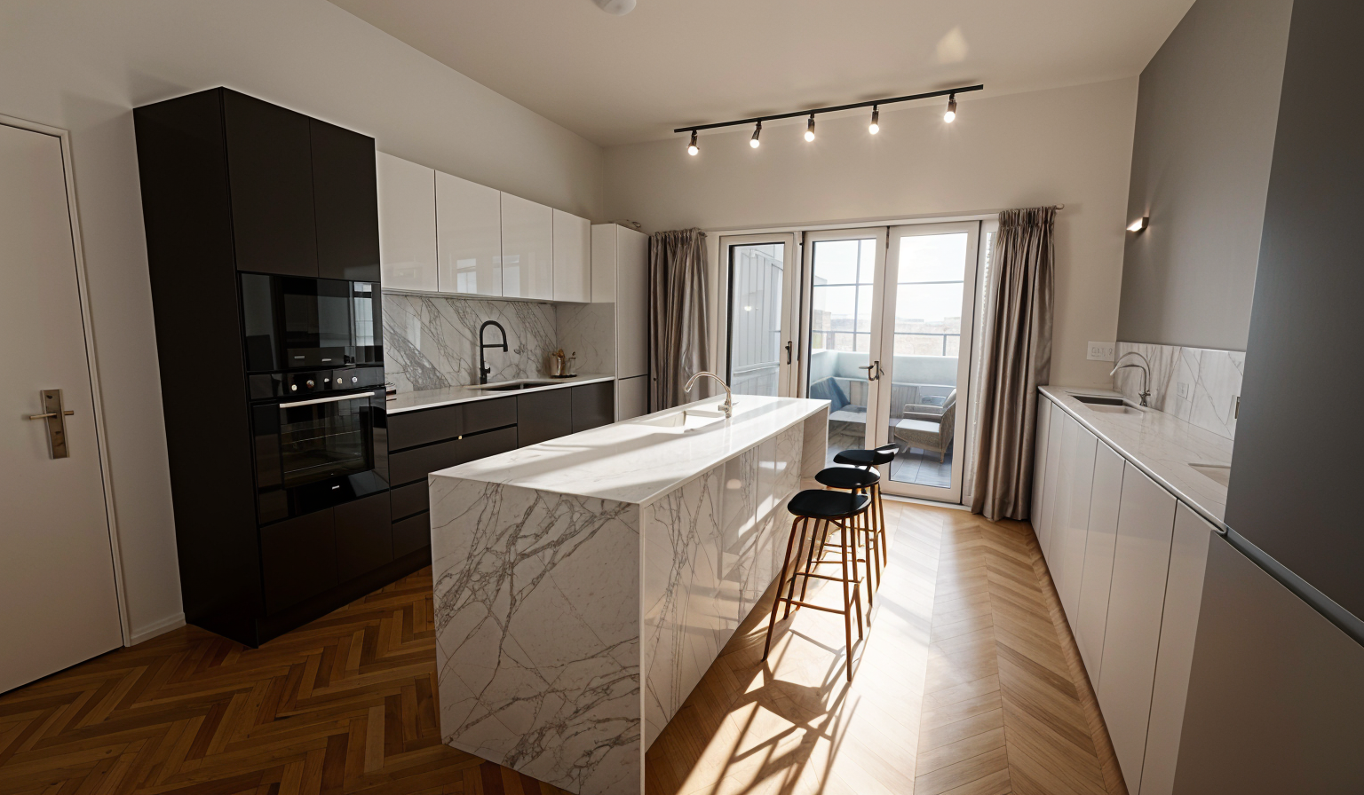 please change the color of red burgundy headbed panel with medium brown tone please keep the nero marquina side table just same as the render