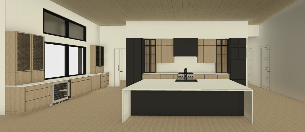 realistic architectural interior rendering in natural daylight preserve all existing architectural elements exactly as shown do not add remove or reposition any structural components cabinetry layout appliances or fixtures unless explicitly stated below countertops two countertop sections only one to the left of the oven and one on the island no other surfaces added material cream marble with very fine thin naturally blending veins soft and organic not bold or graphic no thick or marker like veining cabinetry all light wood cabinetry and flooring shown should render as light neutral oak neutral not warm natural grain not yellow or orange all exterior facing black cabinets must render in matte black no sheen or gloss left window cabinets mesh door detail the tall flanking cabinets on either side of the windows on the left wall must have door fronts featuring a woven metal mesh inset panel a fine tight diamond pattern wire mesh with a dark bronze aged brass tone set within a flat oak frame the mesh has visible depth and texture it is not a printed pattern or perforated sheet but a three dimensional interlocked woven wire hardware no small round brass knobs the cabinet body frame color and proportions must remain exactly as shown in the base rendering only the door insert material changes to this mesh detail styling details interior of left side cabinets add stacked plates and minimal decorative objects visible through the mesh island surface one small potted plant and one fruit bowl placed naturally no pendant lighting added atmosphere realistic natural daylight windows must show lush green trees and a clear blue sky no artificial lighting introduced do not add any furniture fixtures d cor or architectural elements beyond what is described above key addition explained the phrase three dimensional interlocked woven wire not a printed pattern or perforated sheet one change only the tall cabinet doors on the far left wall must be updated to feature a tight dense woven metal mesh insert the pattern should read like an interlocked diagonal weave similar in density to chain link or barbed wire mesh where individual wire crossings are clearly visible and tightly packed with very little negative space between them the mesh should appear dark bronze to near black in tone receding slightly behind the oak frame it is a three dimensional woven material with visible wire depth not a screen not a perforated sheet not an open grid the oak cabinet frame proportions brass hardware and all surrounding elements remain exactly as shown do not alter any other element in the image