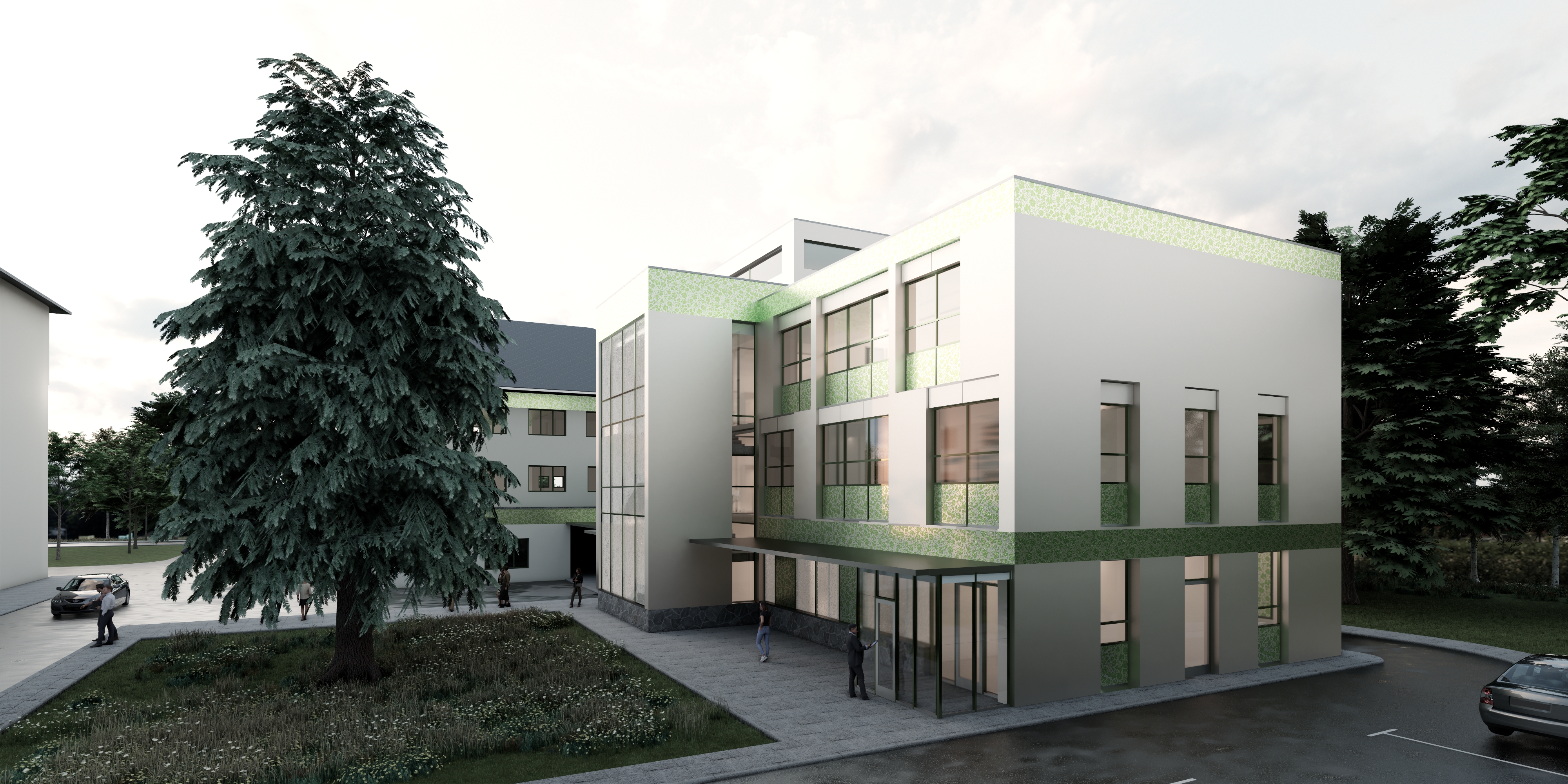 dont change materials and architecture and interior enchance landscape with more natural grass and soft shadows enchance the whole photo more profesional photogaphic depth put some light in the interior sunrise soft light