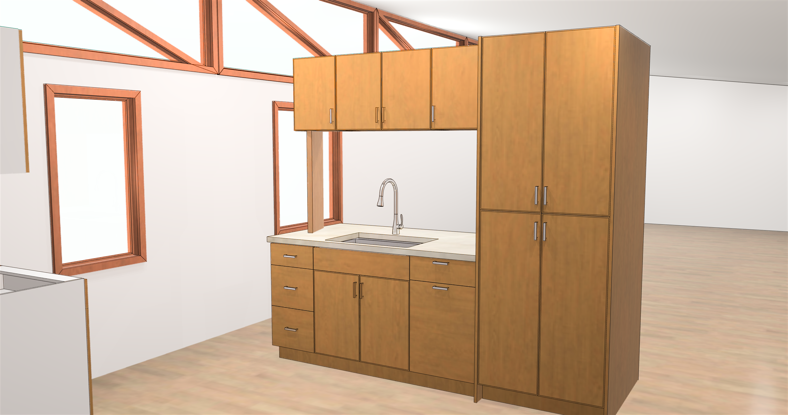 this image is a part of a kitchen the image is angled to be looking at the sink section please enhance the image to be an ultra realistic contemporary kitchen interior photorealistic architectural visualization soft natural daylight from large windows accurate global illumination and soft shadows window trim to match the cabinetry finish keep the floors the same soft warm wood planks custom soft caramel maple wood cabinetry warm undertones subtle natural grain satin finish modern flat panel doors with minimal hardware taj mahal quartzite countertops