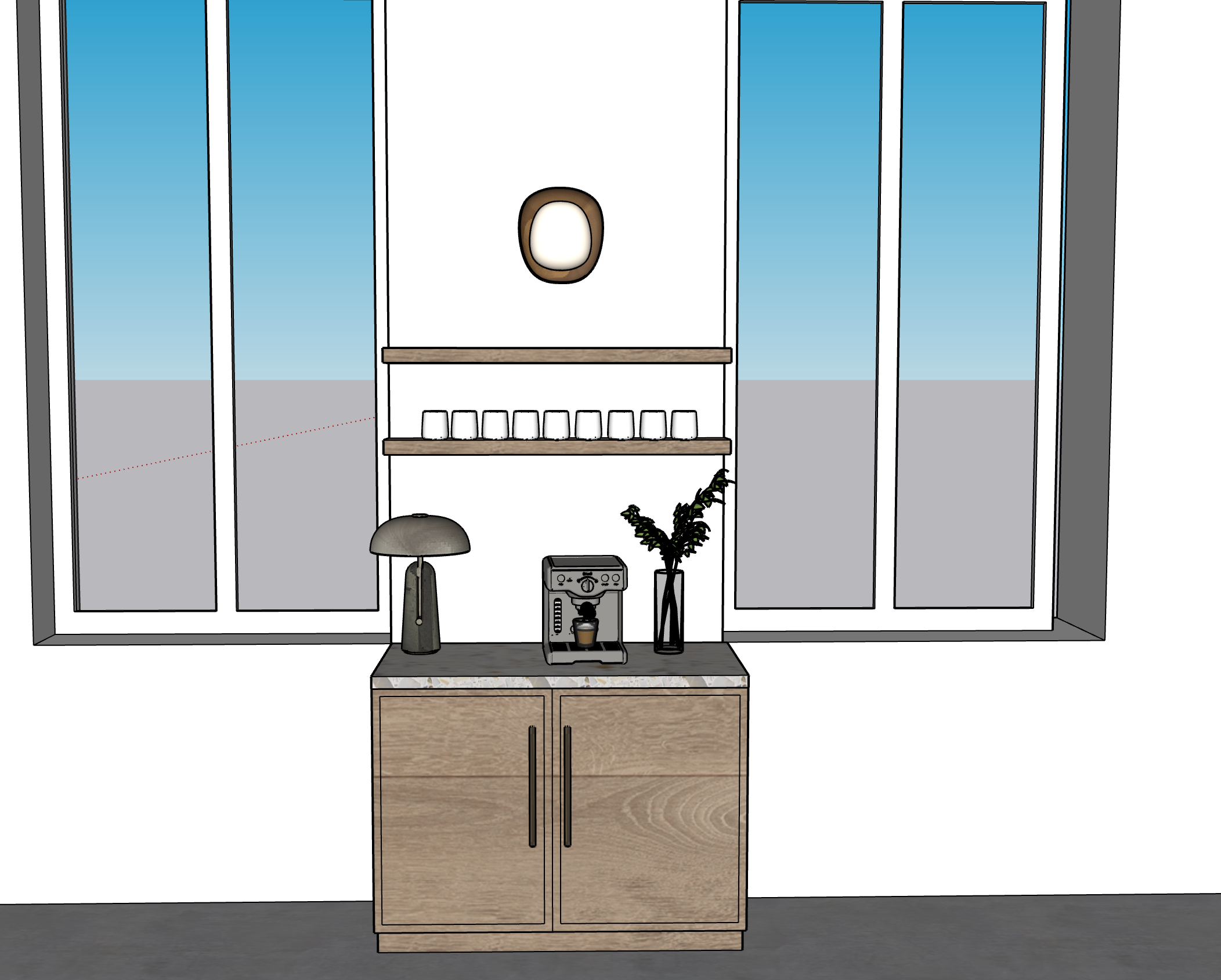 please make the lighting soft even warm and bright keep material as they are shown in the image make the material on the cabinet front white oak make the walls white make the view outside the window have a fire escape and buildings