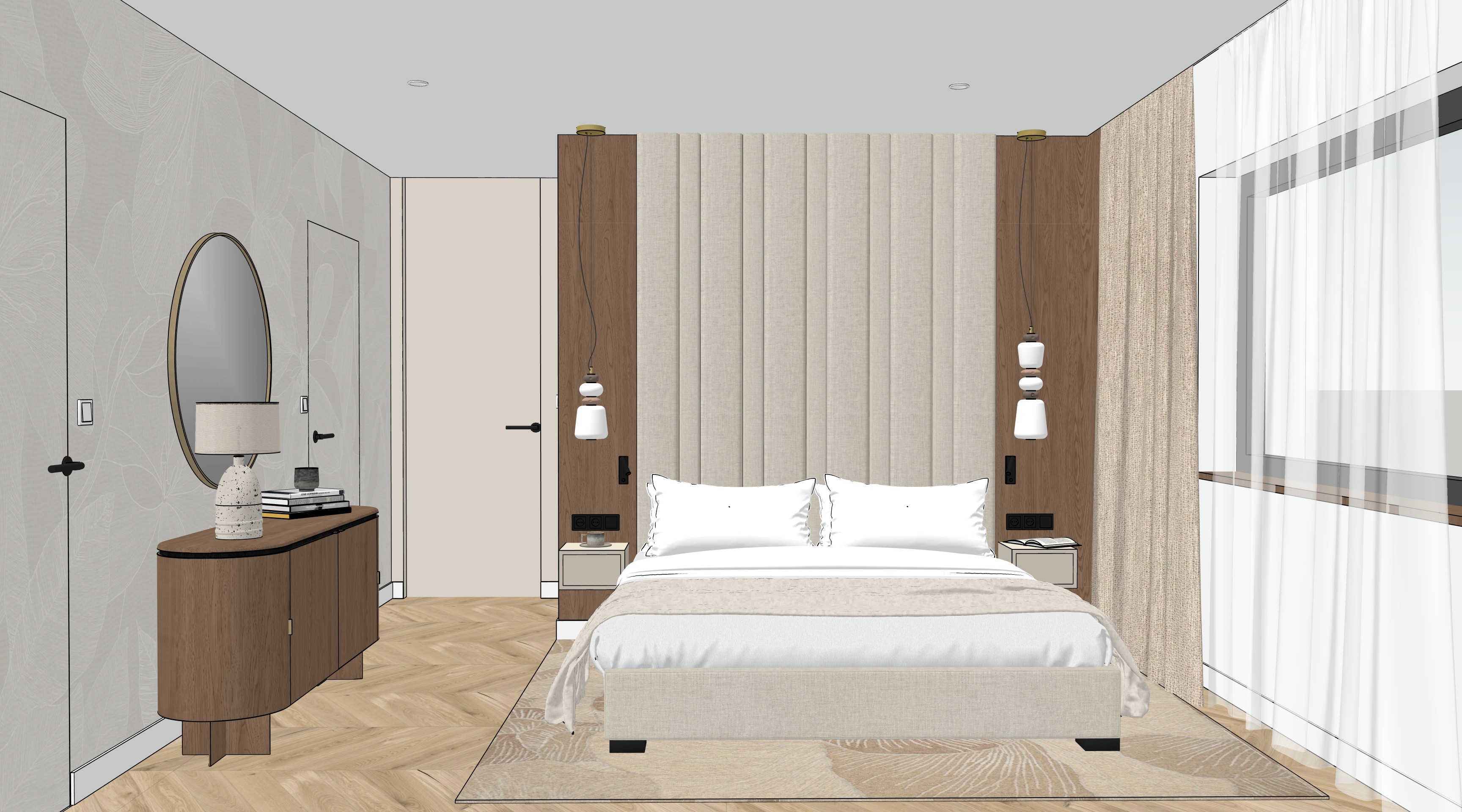 cosy bedroom with upholstery till celling and round mirror on the left