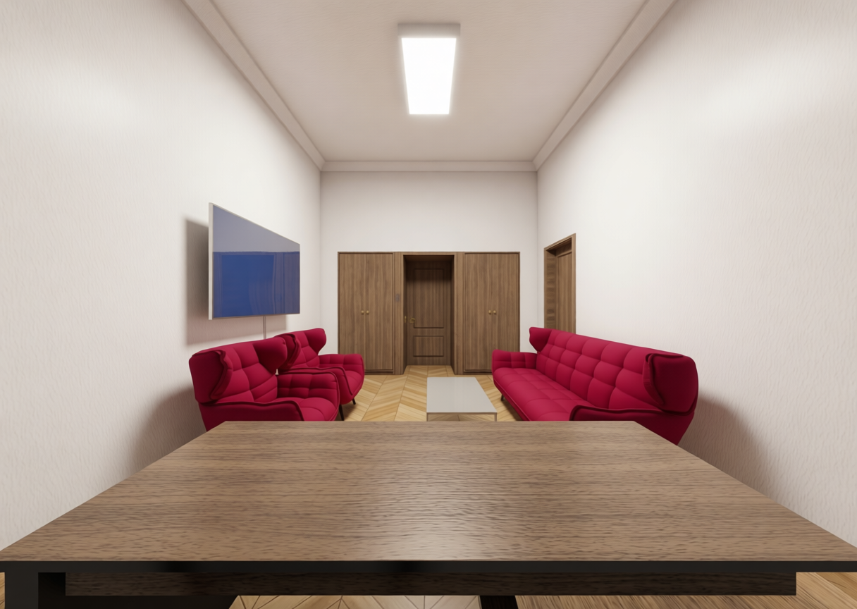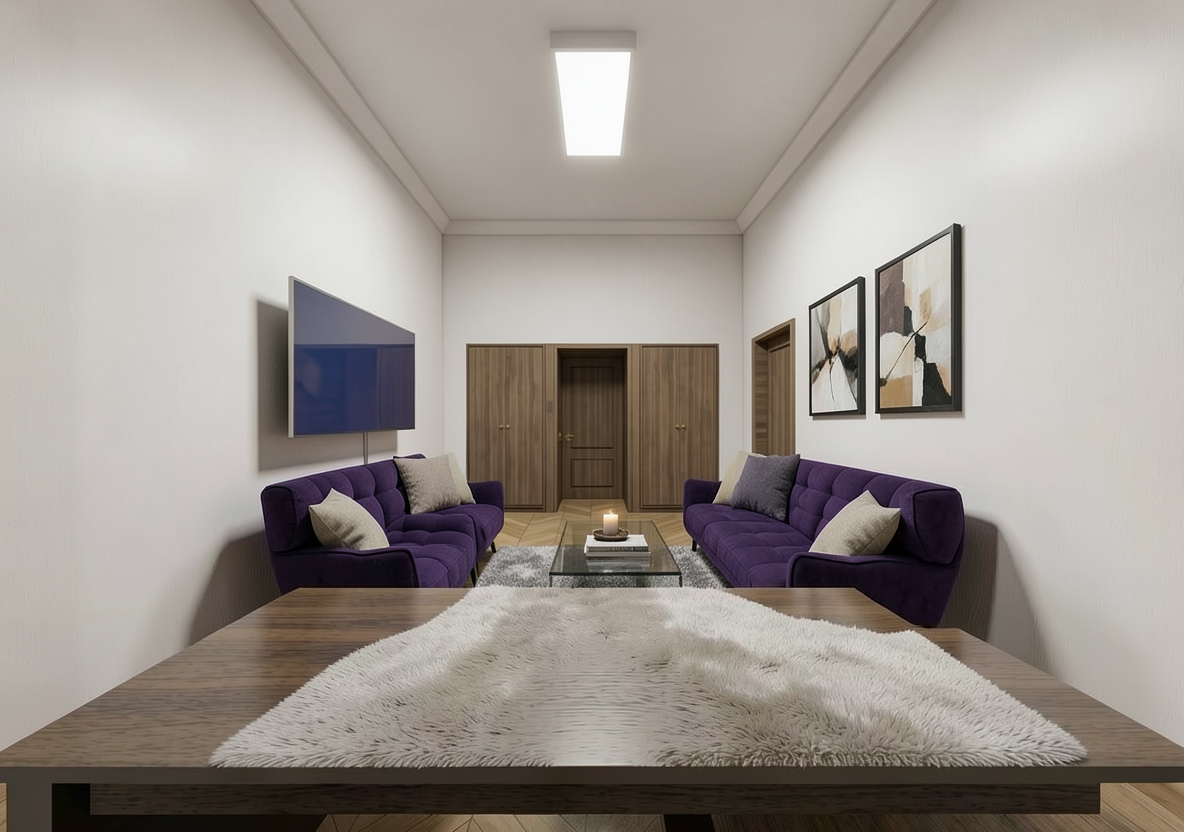 virtually enhance the provided interior render critical hard constraints this is not a redesign or restyling task this is a strict enhancement of an already defined scene you are only allowed to recolor the sofa and lounge chairs to a rich deep purple add minimal decorative elements rug cushions small decor where visible absolute prohibitions do not change any geometry do not alter shapes proportions silhouettes or structure of any furniture do not rebuild reinterpret or replace any objects do not change layout perspective or camera composition do not modify any non target materials desk office chair tv stand closets architecture camera context important for composition the viewpoint is from the office chair looking forward toward the built in closets the desk surface occupies the bottom third of the image foreground the lounge chairs are located on the left side of the mid ground the sofa is located on the right side of the mid ground the tv and tv stand are centered in the background between seating and closets geometry lock global all objects must remain exactly as in the input image this includes desk and desk surface office chair sofa lounge chairs glass coffee table tv and tv stand built in closets no object may be moved resized reshaped or reinterpreted upholstery change only allowed modification recolor only sofa rich deep purple lounge chairs rich deep purple preserve original fabric texture seams cushions and structure do not modify geometry or silhouette in any way office chair keep exactly unchanged geometry material color sofa and chairs must retain identical shapes proportions and positions do not alter cushion segmentation or structure only color changes are allowed rug strict definition maintain one large rug if visible across seating area rug must be soft fluffy texture no pattern neutral tone off white beige or very light grey do not introduce persian geometric or patterned rugs coffee table decor add minimal decor only if visible small tray one candle or sculptural object small stack of books magazines keep subtle and realistic sofa and chairs styling add 2 3 cushions on the sofa if visible use neutral scandinavian tones beige grey muted colors do not affect geometry or silhouette desk surface foreground add minimal desk accessories if visible desk lamp small plant notebook or paper object pen holder keep desk clean and uncluttered wall art add 1 2 abstract artworks if visible on walls minimal scandinavian style thin frames low contrast properly aligned plants add 1 3 indoor plants if visible matte neutral planters ceramic or concrete do not overcrowd the scene lighting preserve original lighting direction and intensity only enhance realism balanced exposure soft shadows do not introduce new lighting sources or styles important the composition must remain exactly as in the input image do not restyle redesign or reinterpret the scene do not shift object positions to improve framing if any modification risks altering geometry do not apply it final result the same image same geometry same perspective with sofa and lounge chairs recolored to deep purple desk surface minimally accessorized consistent neutral fluffy rug subtle scandinavian decor zero changes to any object geometry layout or composition
