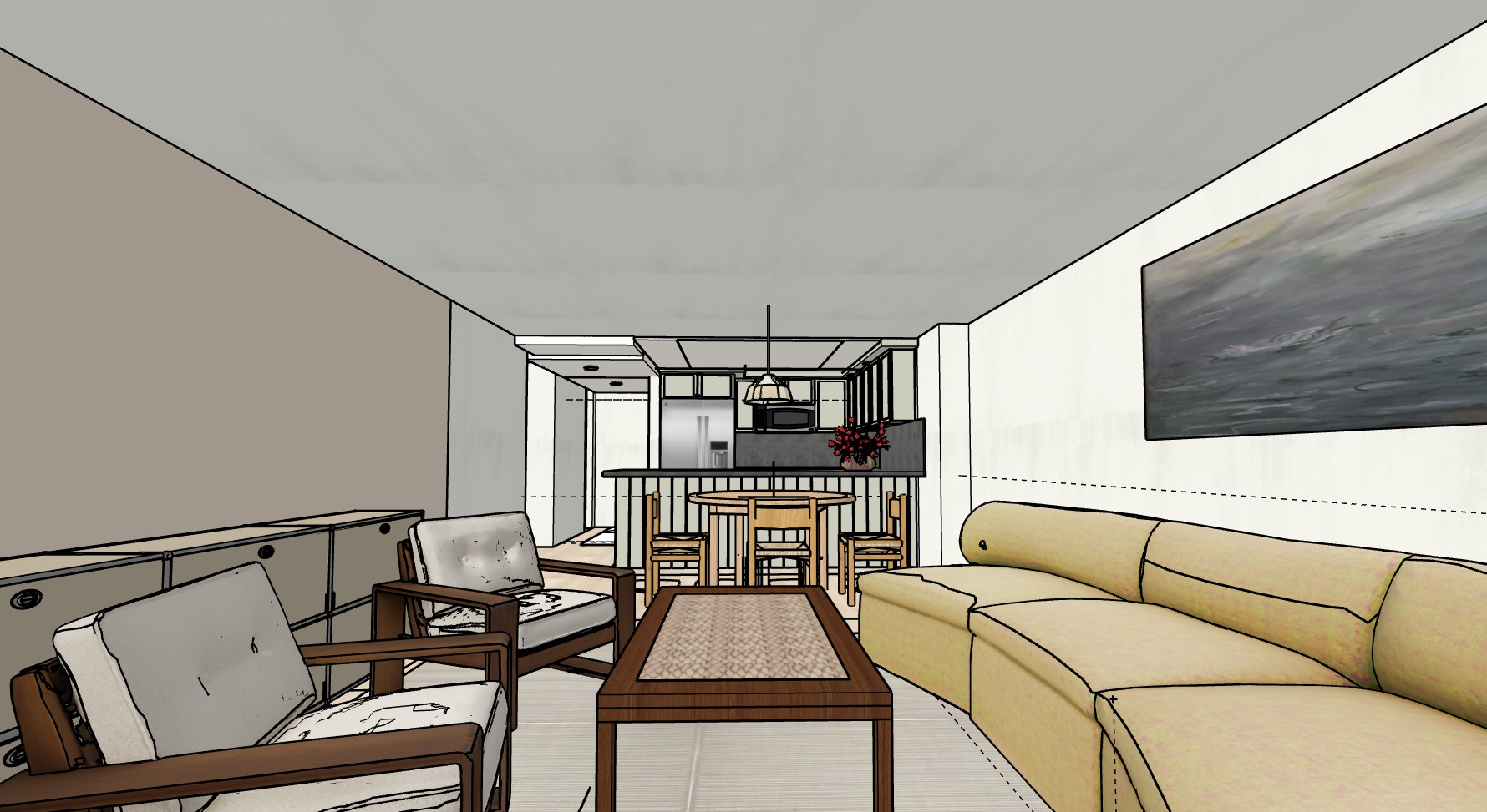 modern minimalist open plan living room and kitchen scandinavian inspired design with a calm elegant editorial interior style soft neutral palette with warm beige tones and diffused natural daylight flooring is a very light oak wood flooring two mid century armchairs upholstered in long haired cream curly sheepskin paired with a low profile modular sofa in pastel mustard yellow fabric white seagrass carpet underneath sofa coffee table and armchairs rectangular wooden coffee table featuring inset square ceramic tiles on the tabletop subtle artisanal detail cabinetry behind chairs in tan lacquer with chrome accents round wooden dining table with simple chairs positioned between living area and kitchen kitchen cabinetry in a muted subtle light grey with blue green undertones paired with a charcoal stone countertop and matching backsplash creating a refined contrast stainless steel appliances integrated cleanly large abstract painting on the wall minimal styling with a vase with tulips on kitchen counter central pendant lantern softly illuminated casting a warm ambient glow and enhancing the serene atmosphere natural materials clean lines uncluttered composition soft shadows global illumination photorealistic architectural visualization wide angle lens eye level perspective high end editorial quality