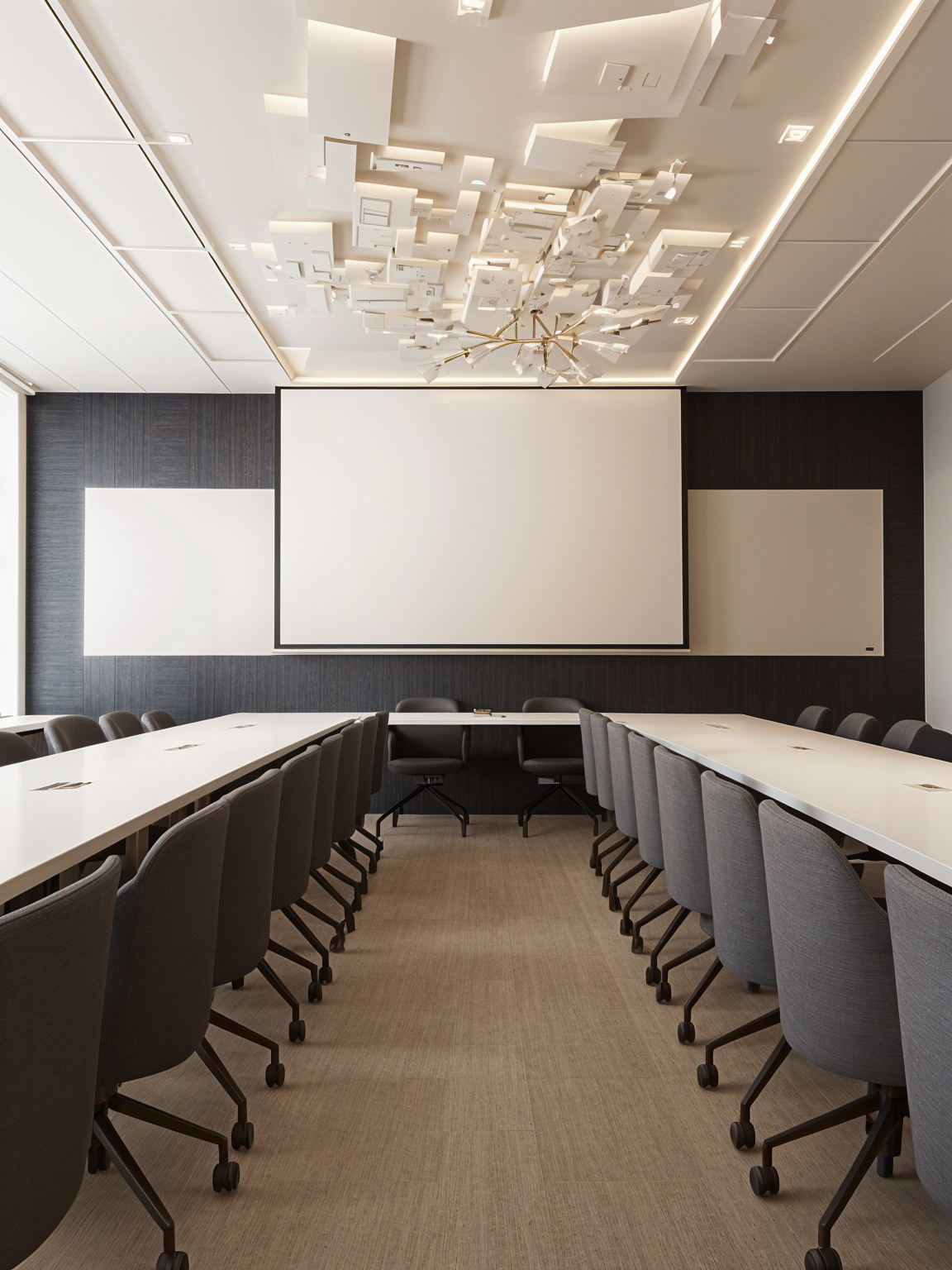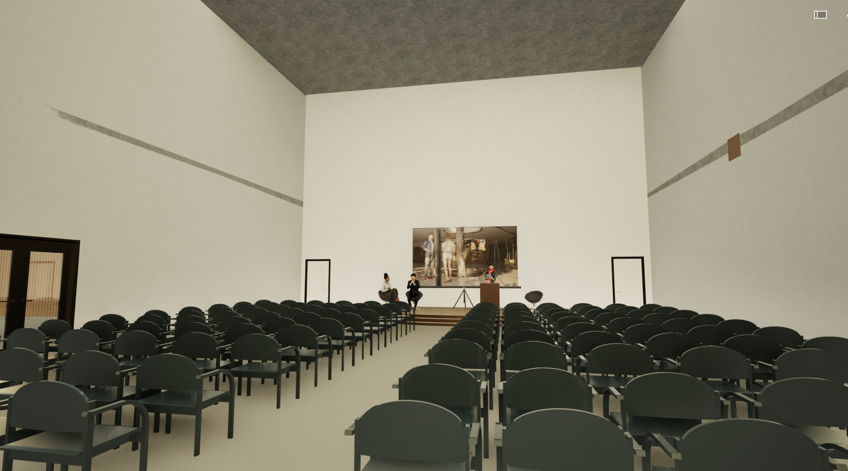 using this base room image i need to make this more alive and realistic this is for a product lunch and i want the seats to be filled with a good amount of people that is not overwhleming also the walls should be lined with floor to ceiling curtains but also missing is a wooden structural truss that is on the ceiling make it look presentable and like a nice producy launch with goof lighthing architecture
