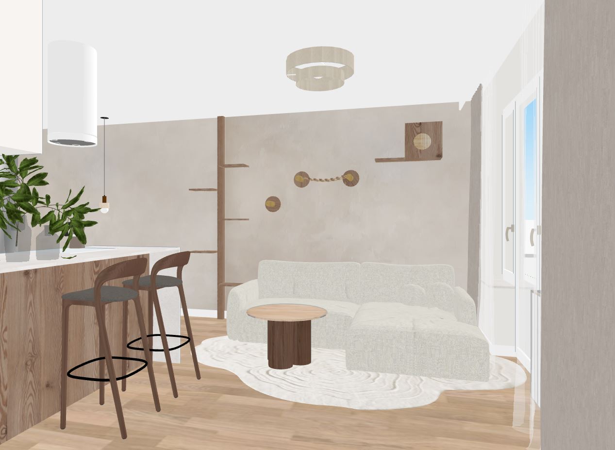 do not change anything the ceiling is white make it realistic small tabel has a dark wood leg and travertin desk show a cat on a wall