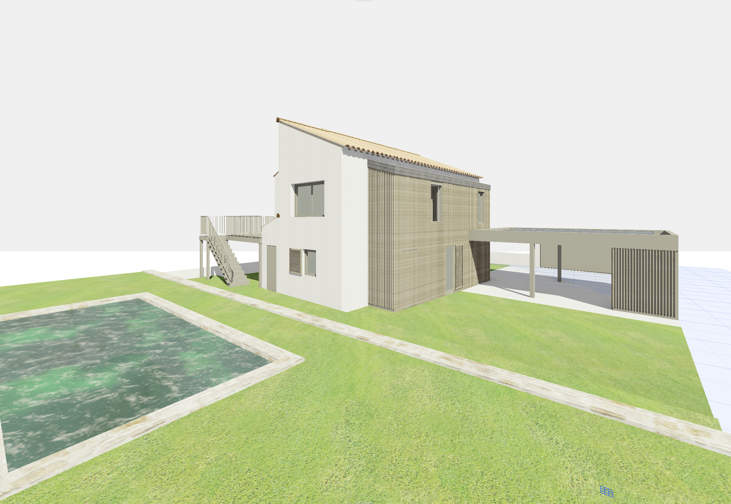 light and reflect in the windows and the pool park and houses in the background don t change the angle of the camera don t add furniture there is the house at the left of the image