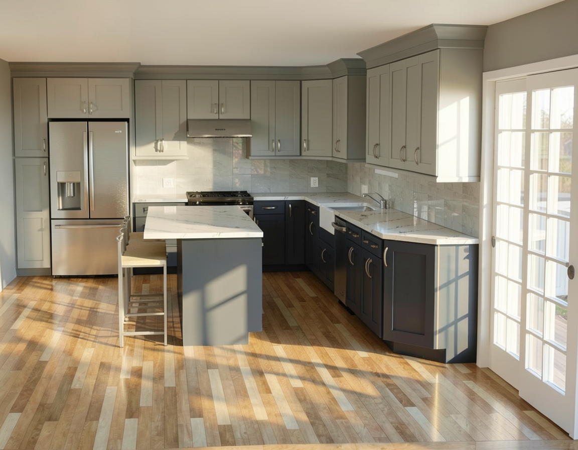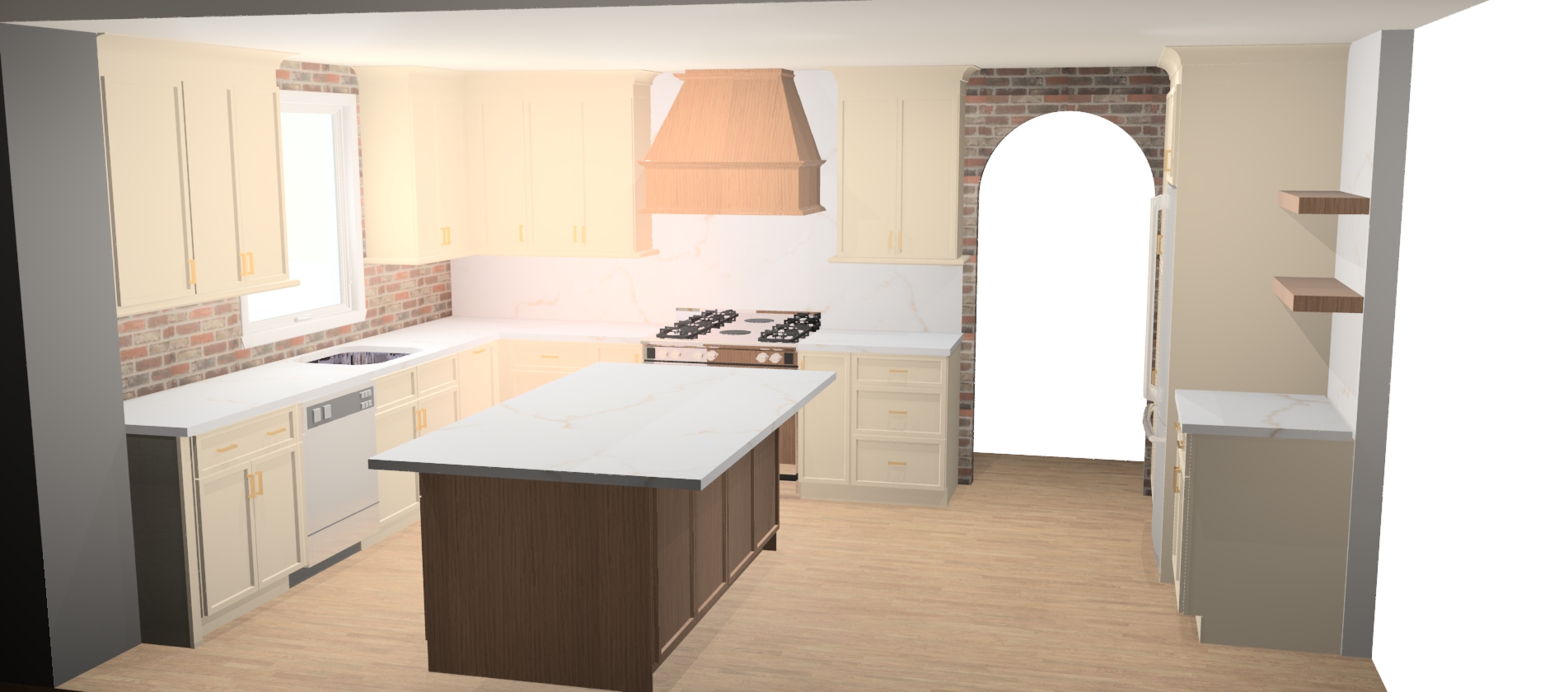 make this look realistic keep colors the same the archway is looking into a dinning room add stools around the back of the island and side