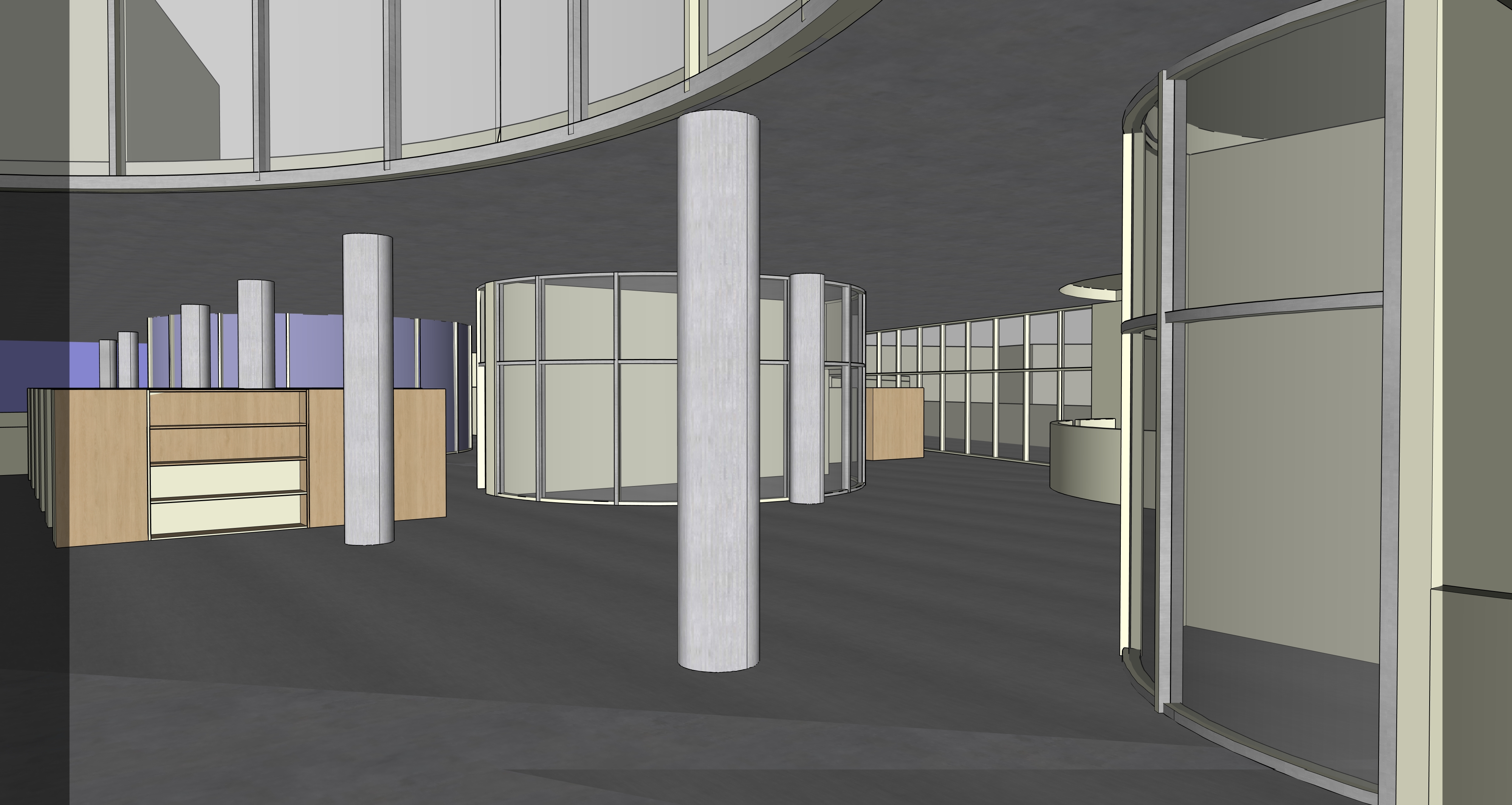 modernist interior shot it is a perspective view of a library room the floor ceiling and structure are made of concrete the furniture is natural wood with curtain walls and white painted walls if possible fill the existing furniture with books have a realistic effect architecture