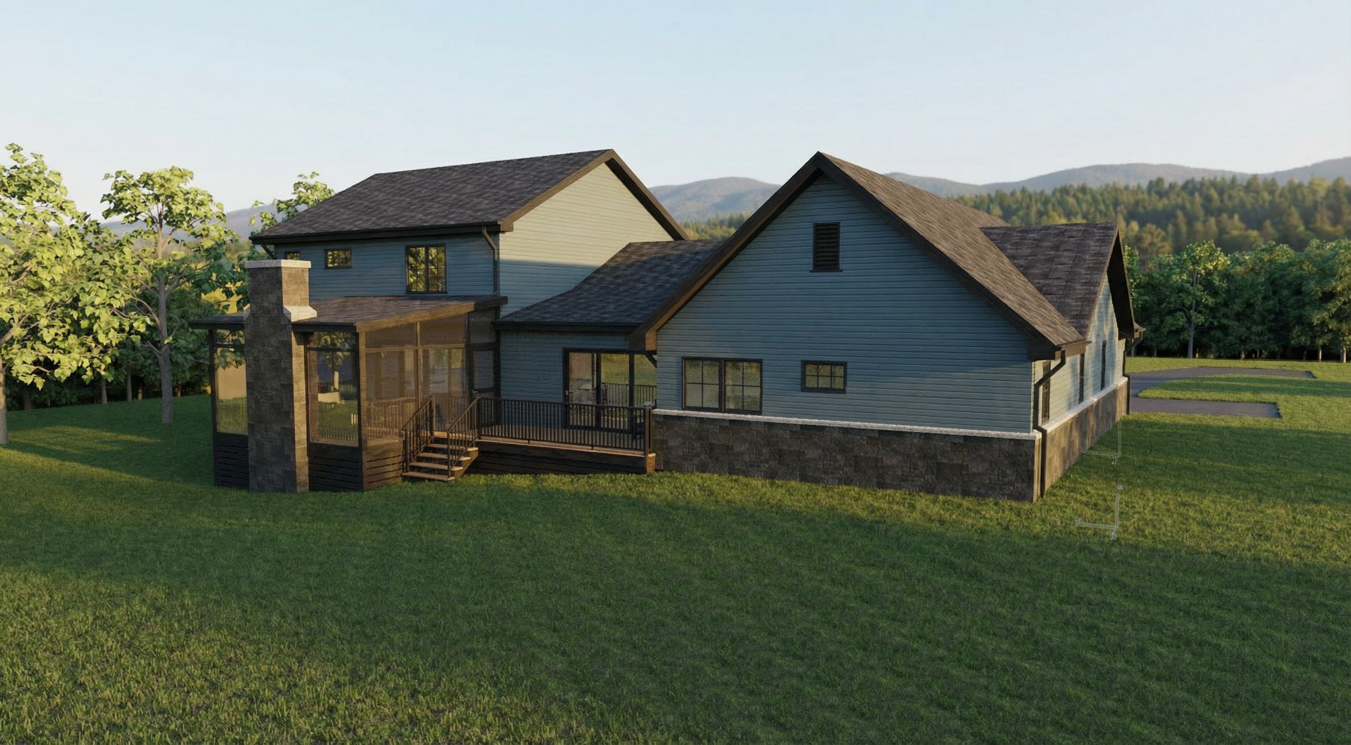 make this look like a real building do not change any colors or design elements put it nice landscaping around it with concrete infront of the doors and a sunny day with trees native to iowa