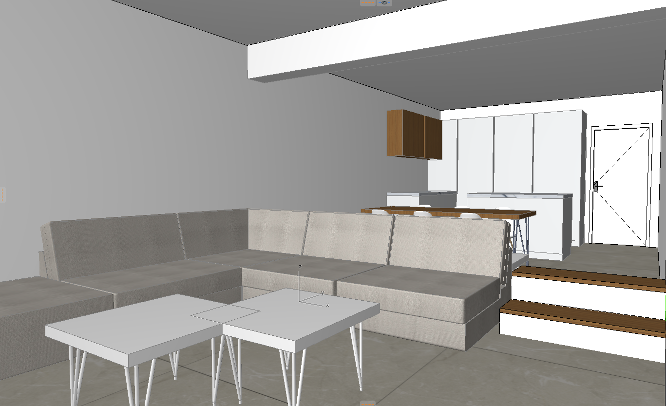 stage it as a modern flat with hidden lights on the ceiling comfy corner sofa in front of the knee wall kitchen in timber and white dining table at the rear