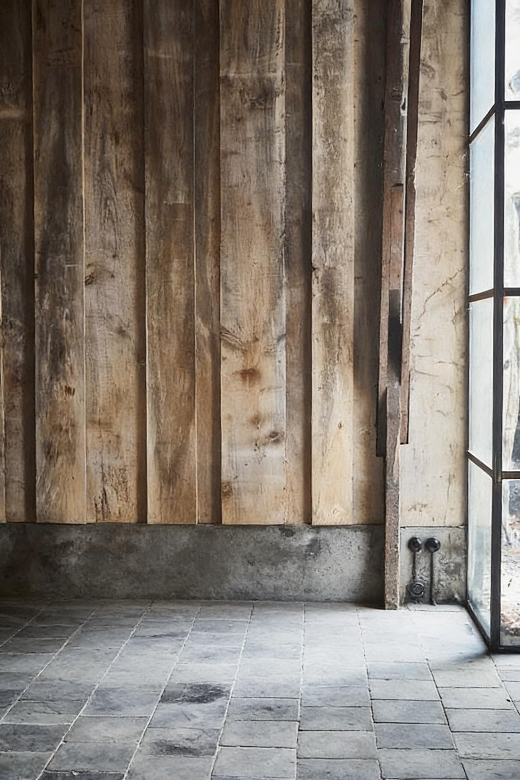 place a sofa against the front wall with a stone base like the floor and blue cushions
