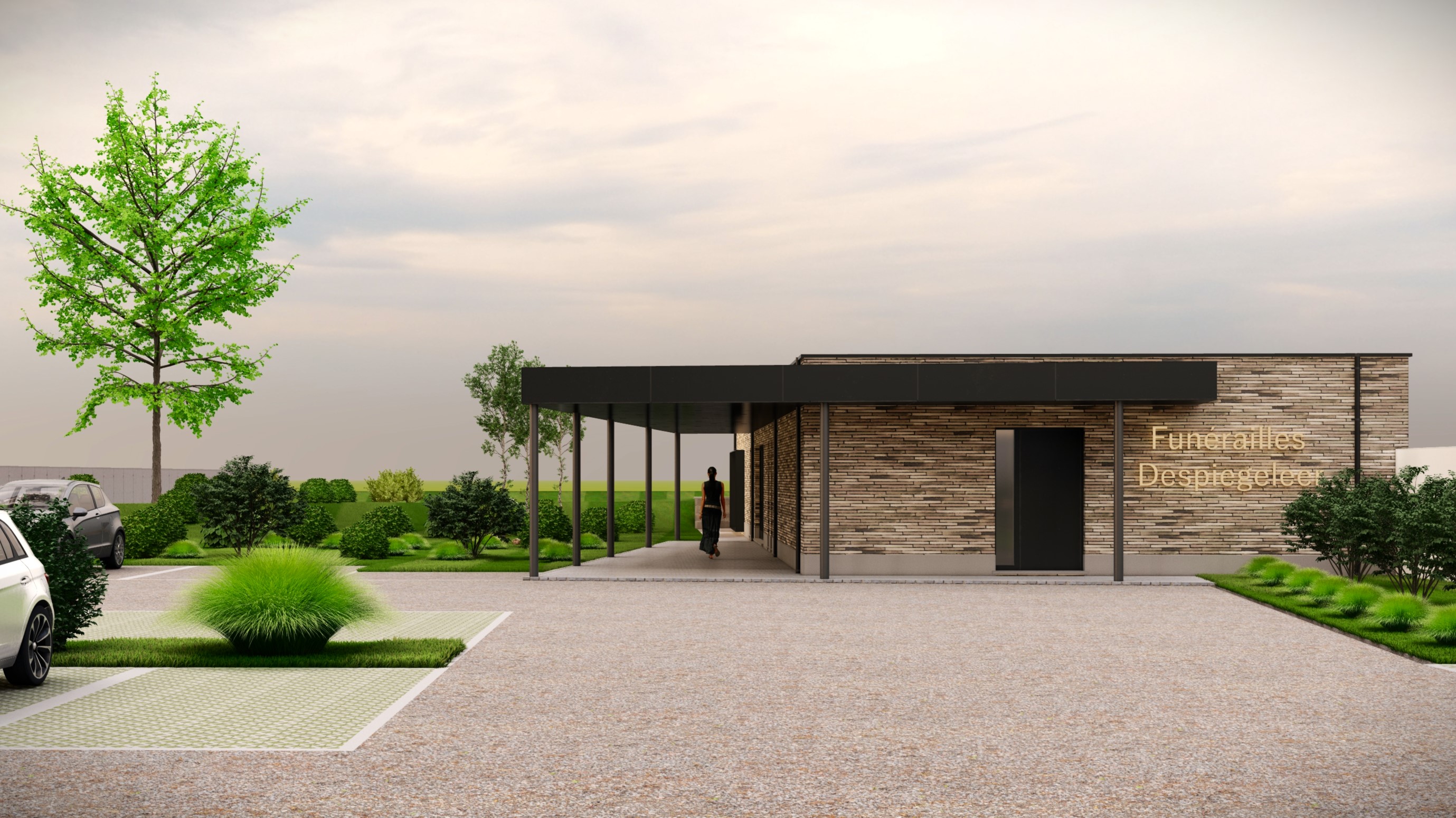create a high quality photorealistic architectural rendering based on the provided reference image preserving the original architectural design volumes proportions material palette textures and color scheme as shown in the reference image maintain the existing roadway and sidewalk in the foreground exactly as in the reference image including their alignment materials and urban character enhance and refine the existing vegetation with carefully composed planting mature trees layered shrubs ornamental grasses and ground cover improving depth and atmosphere while keeping the architecture visually dominant include a limited number of human figures and a few context appropriate vehicles similar to those in the reference image used strictly to indicate scale and everyday use characters should be discreet well integrated and secondary to the architectural composition use warm natural daylight with realistic shadows soft reflections and atmospheric depth the overall result should be elegant calm and visually appealing a refined architectural visualization suitable for professional presentations competitions and client communication no vegetation in the front as it is the access to parking no grass in the front people should be very few