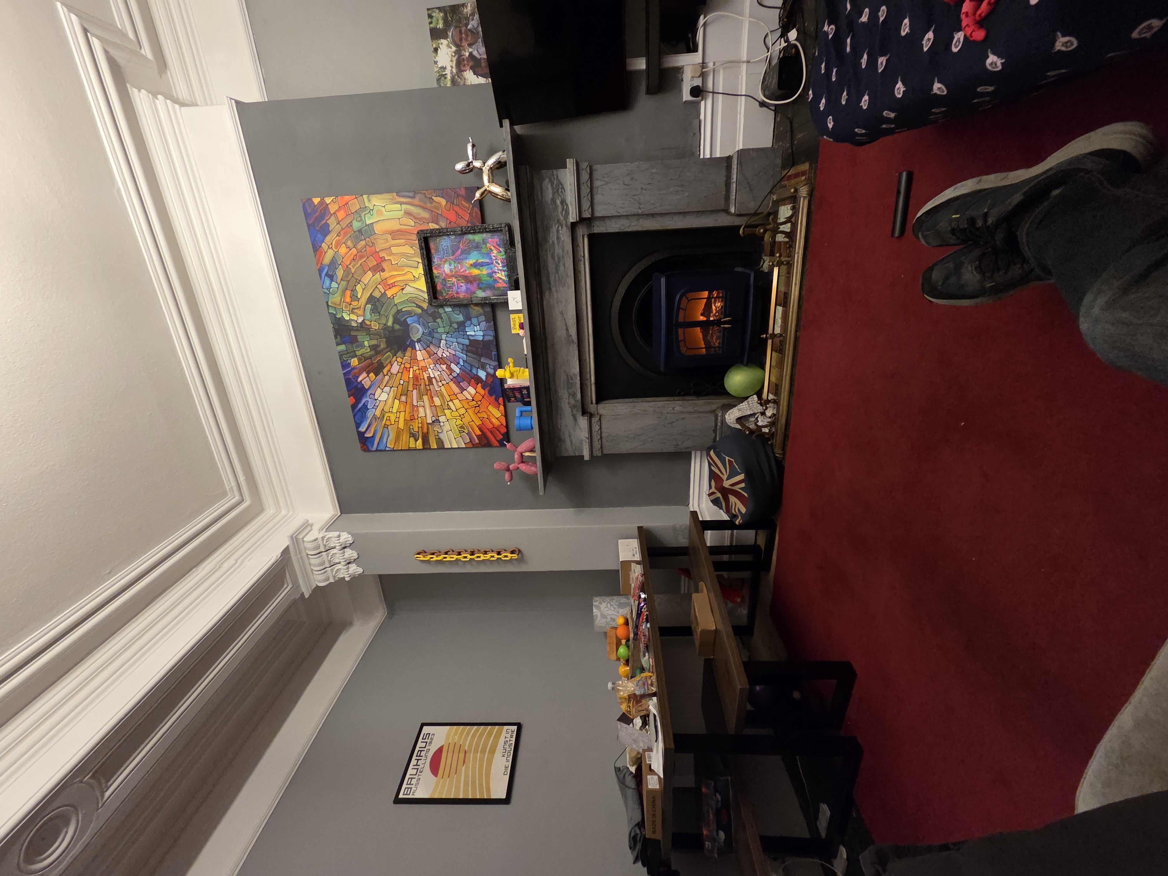 show this room white walls modern furnishings and a mirror above the fireplace