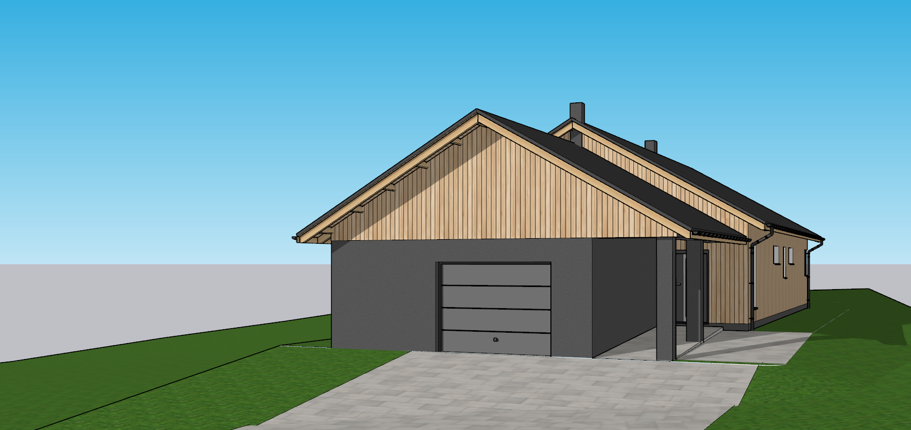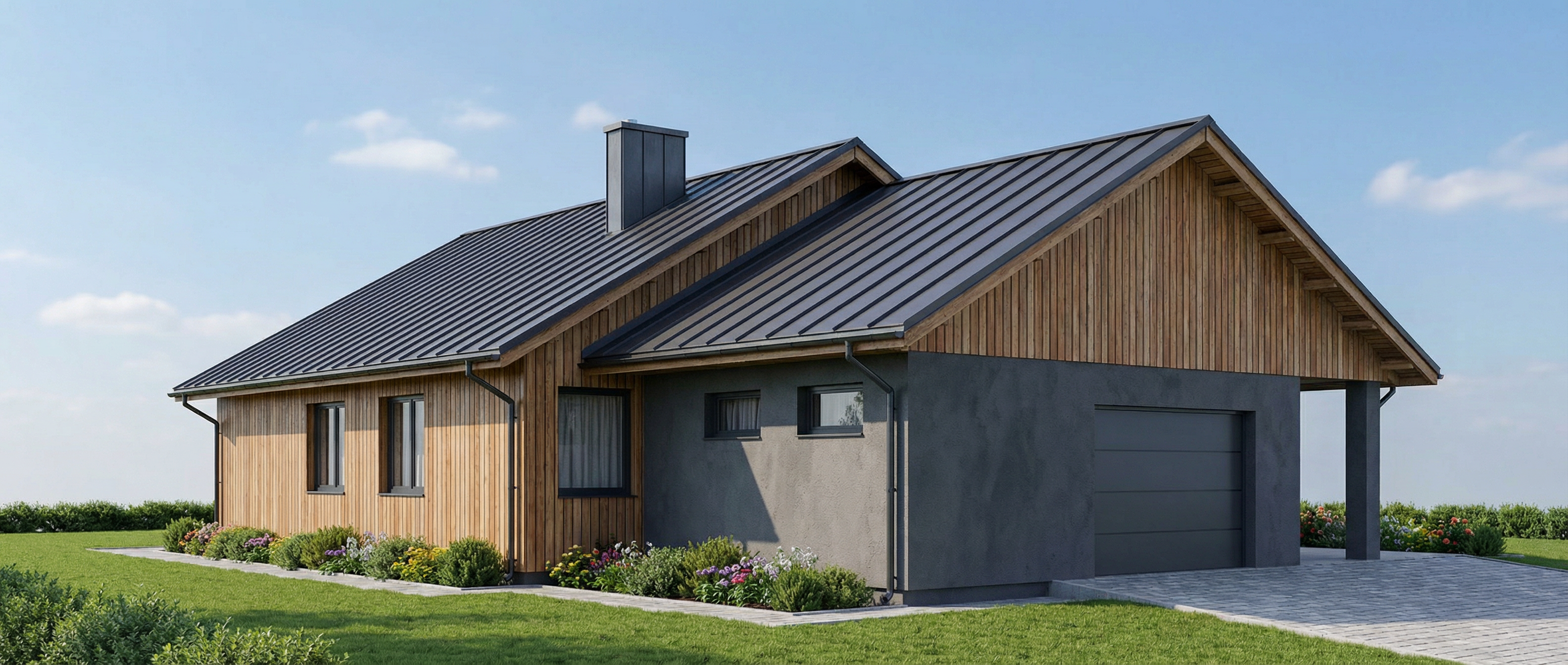 metal dark roof wooden walls dark plaster dark windows and door courtins in windows low bushes and flowers chimney covered with dark sheet metal