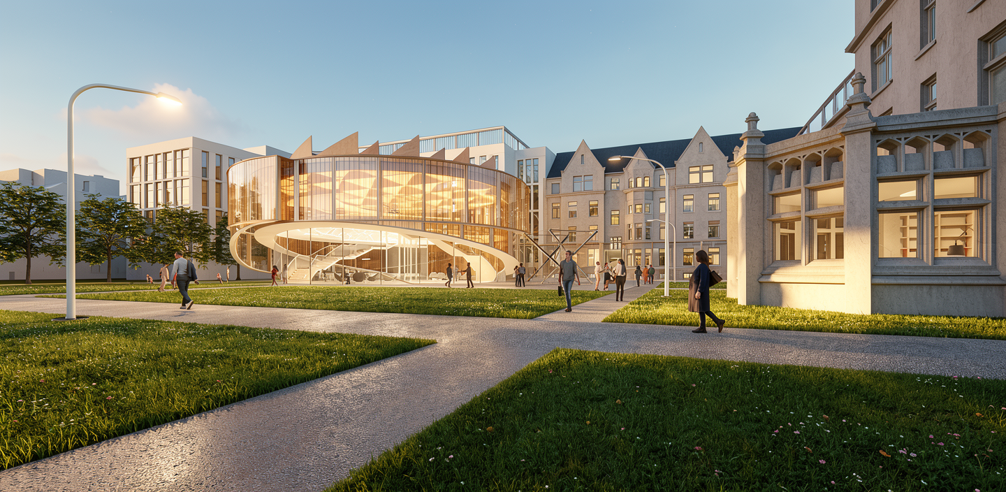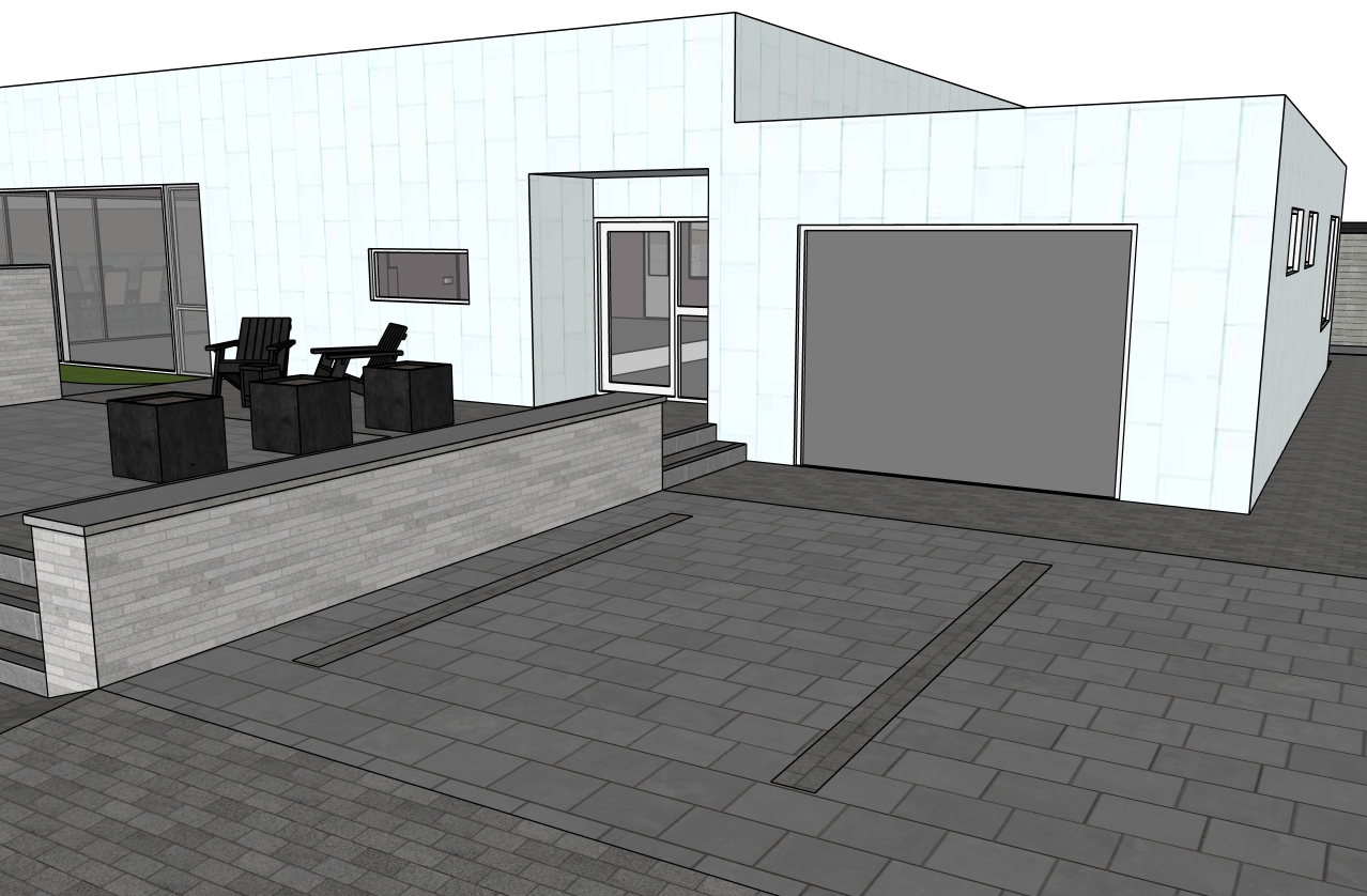 photorealistic architectural rendering of a modern scandinavian house in iceland white metal facade panels dark garage door porcelain tile terrace and driveway paving light brick retaining wall outdoor lounge chairs and cube tables minimalist nordic landscape design natural lighting realistic materials high end residential architecture
