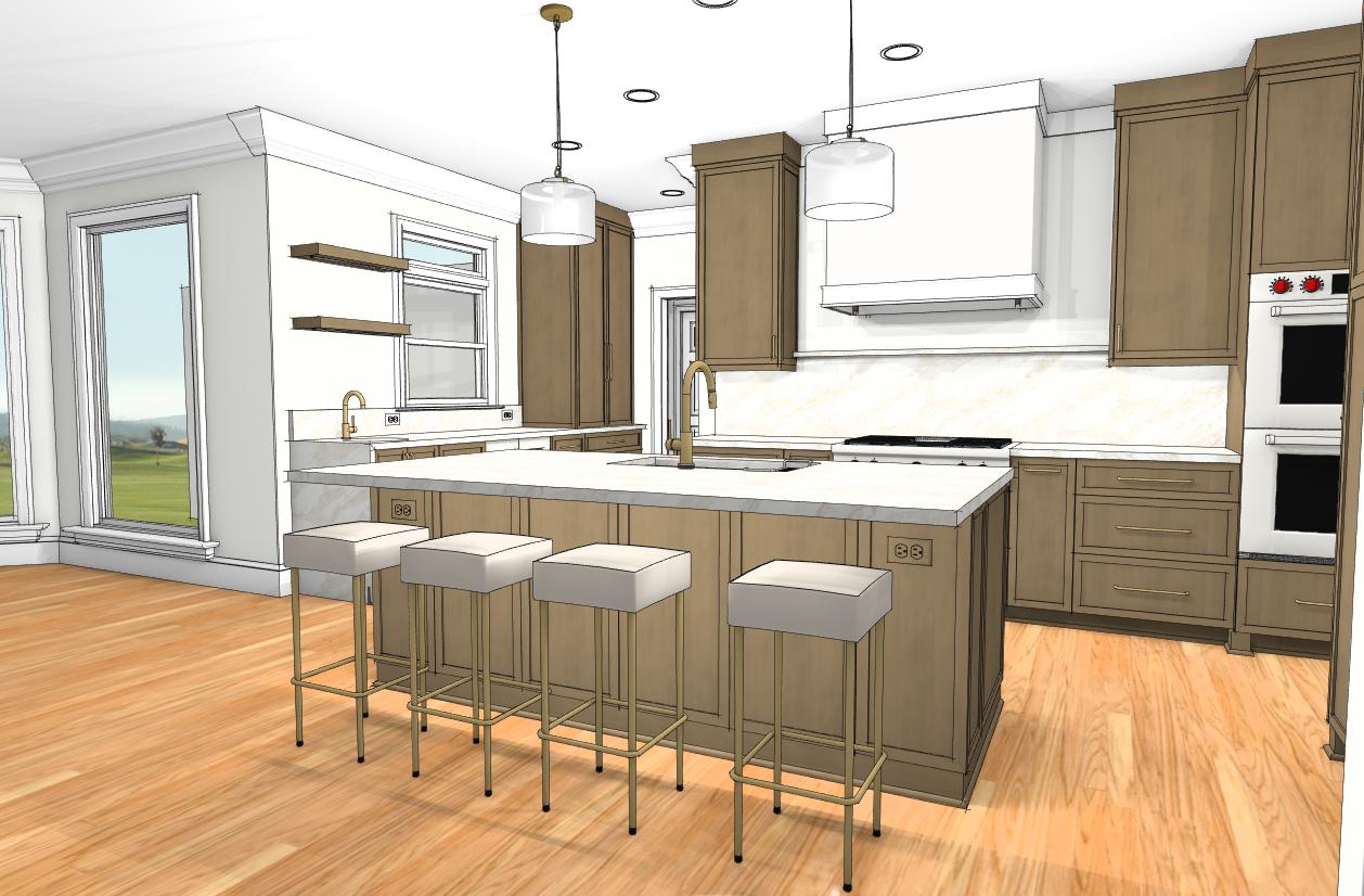 add kitchen accessories and daylight from windows add ambient light coming from under wall cabinets open shelves and under countertop of island add a white plaster finish to hood