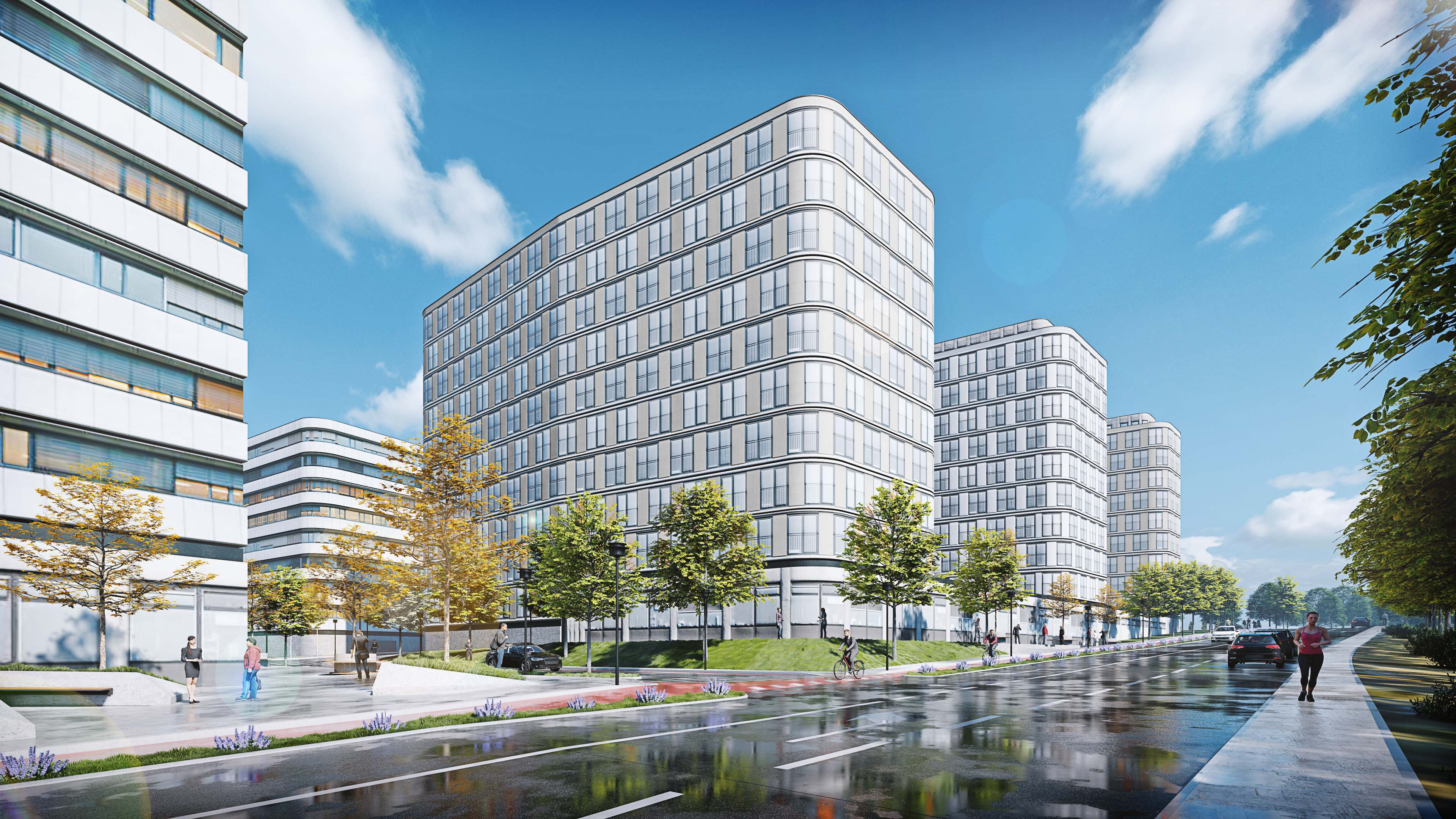 match the atmosphere and color grading of a calm overcast blue hour architectural visualization soft cool daylight under a bright cloudy sky with subtle warm interior window glow 2700 3000k visible through glass overall palette cool desaturated blues and blue greys in the sky and shadows neutral concrete stone greys with gentle warm amber accents from interior lighting very low contrast smooth tonal transitions slightly lifted shadows controlled highlights no clipping clean crisp details natural realistic lighting diffuse skylight soft ambient occlusion minimal harsh shadows slight atmospheric haze for depth mild aerial perspective photoreal cinematic but subtle modern archviz look keep the existing geometry camera framing context materials and textures exactly the same change only lighting atmosphere exposure white balance and post processing color grade