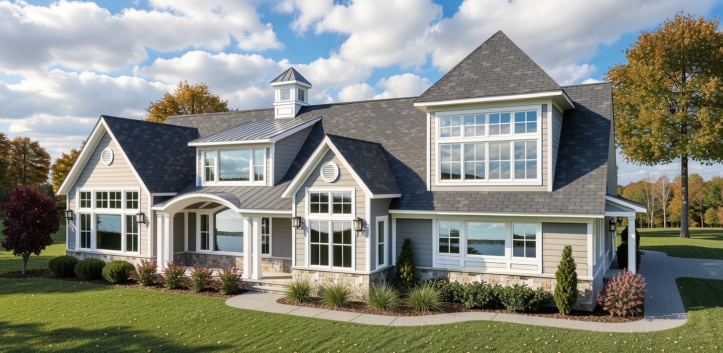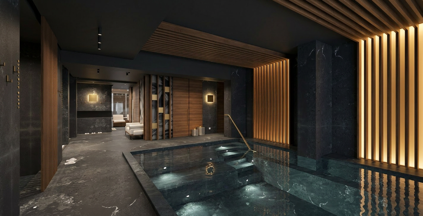 create a beautifully rendered kitchen scene with a warm inviting atmosphere the cabinets should be deep forest green complemented by a glossy elegant black granite countertop the refrigerator is sleek and white with gold handles adding a touch of luxury the farmhouse sink is pristine white harmonizing with the overall elegance incorporate a rustic wooden cabinet with intricate carvings for a vintage look the backsplash is a sophisticated glossy light blue tile reflecting soft light include a maroon cushioned bar stool for a pop of color and a cozy feel the ceiling is accented with wooden beams and soft natural blue ceramic flush mount ceiling lights and a black 2 lite pendant over the island enhancing the warm ambiance the floor is a light natural wood adding warmth and comfort