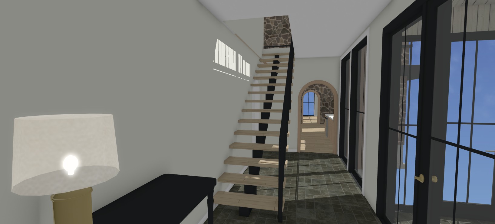 rendering shows a hallway in a contemporary home in the immediate foreground on the left is a black console table with a brass table lamp behind the table is a modern staircase with white oak trades and a single black stringer leading up to the second floor beyond the staircase a stone wall is visible the hallway has a slate floor that leads to a arched opening that has white oak trim through the opening cabinets in a kitchen are visible on the left and a stone wall with another arched opening can be seen the left of the hallway contains floor to ceiling windows with black sashes and white trim a doorway is in the immediate foreground on the right of the hallway with a door that opens to an attached greenhouse the windows show a forested yard with afternoon light streaming through the leaves rendering is 8k and hyperrealistic