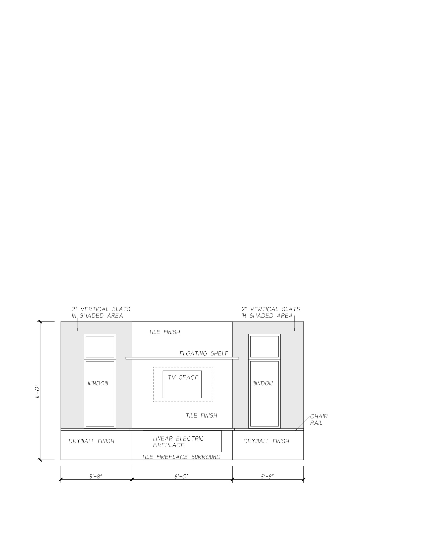 create an interior view of this wall the ceiling height is 11 the wall width is 19 4 the center section that is 8 wide protrudes forward 12 from the back wall from the chair rail to the floor the center section that is 8 wide protrudes forward 6 from the back wall from the ceiling to the top of the chair rail the back wall with the windows will have 2 vertical wood slats painted light blue above the chair rail where shaded the floating shelf above the tv should be dark brown the finish around the tv and fireplace will be light marbled tile show an 80 tv with an ocean scene drywall finish under the window chair rail the center 8 wide section is the only area that protrudes from the back wall the chair rail under the windows continues to run across the top of the fireplace