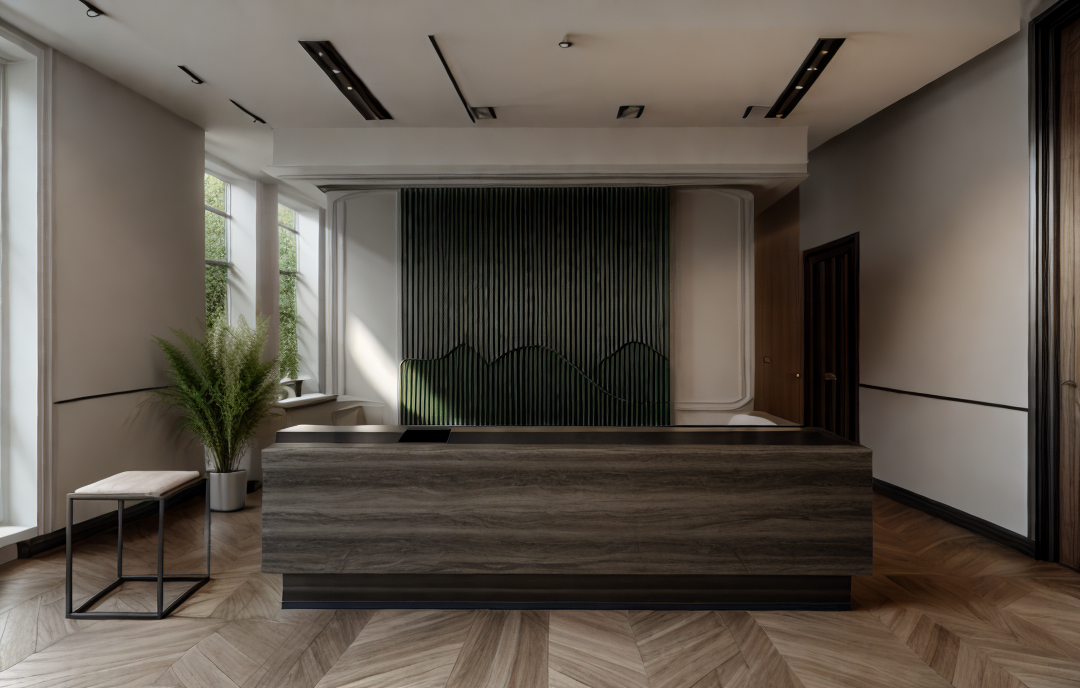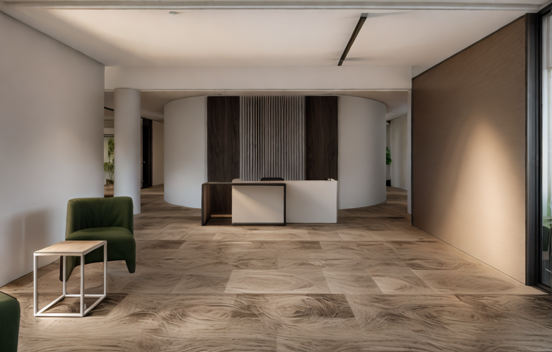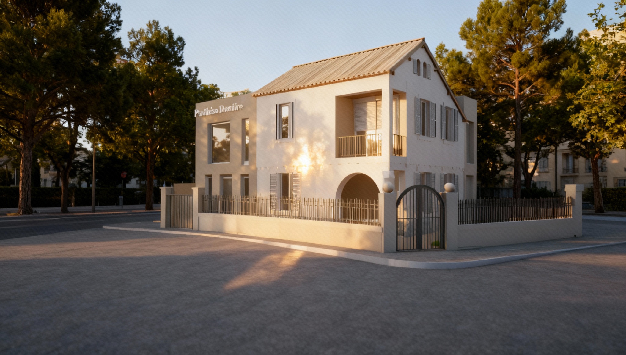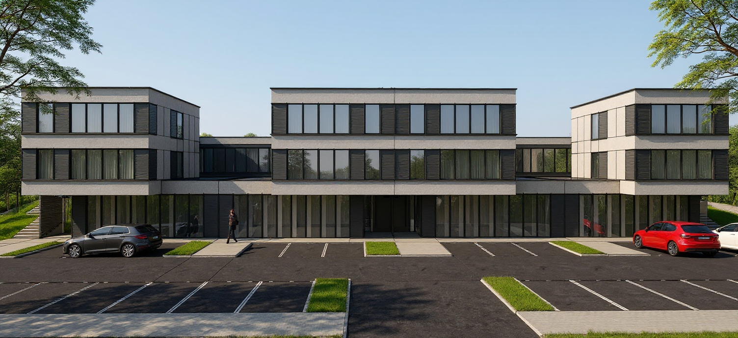 create a photo realistic image for this building keeping create a fall version with people cars lights coming from inside the unis