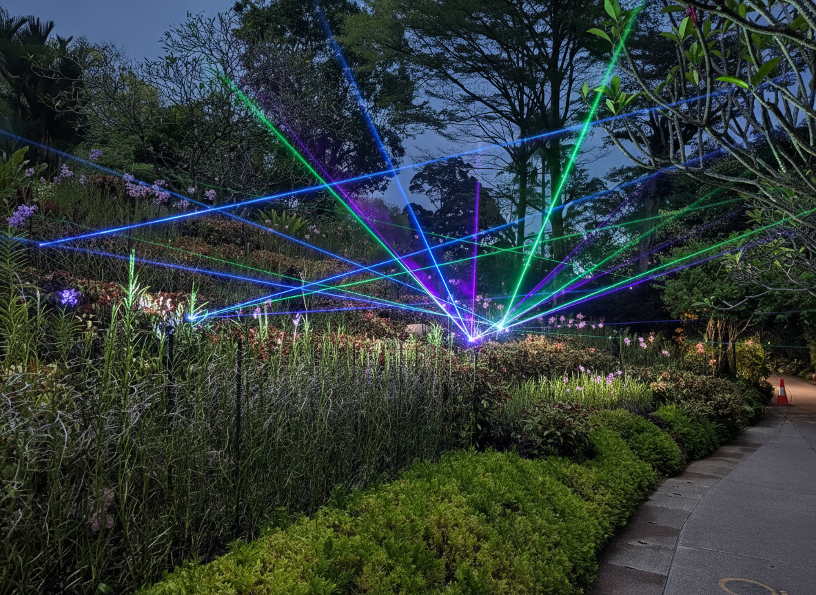 a render of a night installation at the singapore national orchid gardens numerous laser beams hit the landscaping plants and create a star field like effect lights reflect on iridescent surfaces that cast multi coloured glows around the space