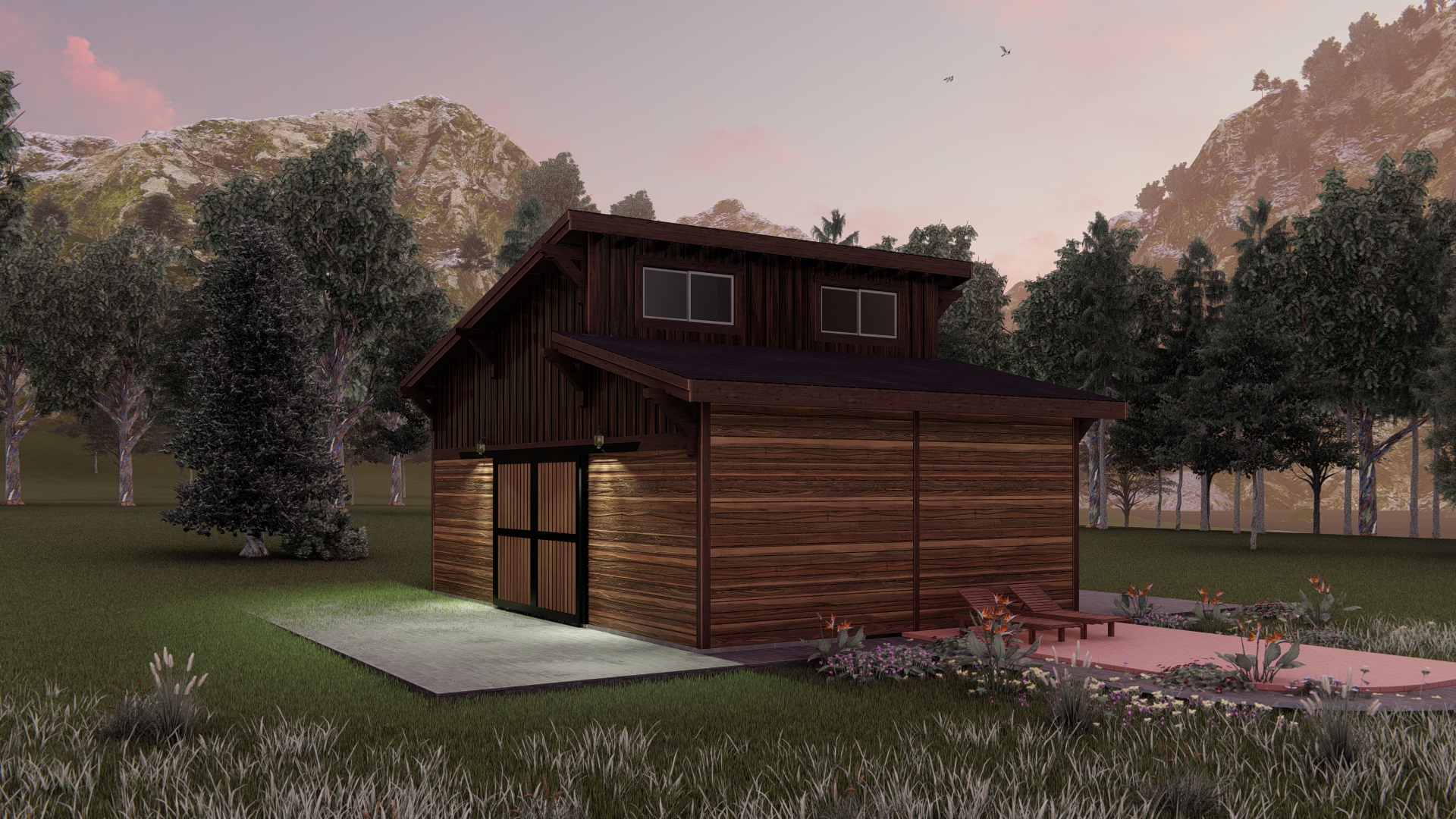 clean architectural exterior rendered in cinematic daylight lighting black metal standing seam roof warm natural wood cedar siding on the lower floor and dark cedar siding on the top floor forest background glass reflections on the windows natural wood textures high fidelity photorealistic visualization crisp shadow falloff refined fa ade geometry richly detailed grain patterns soft atmospheric depth calm minimal landscaping premium architectural photography mood ultra clean composition and materials solid wood barn doors