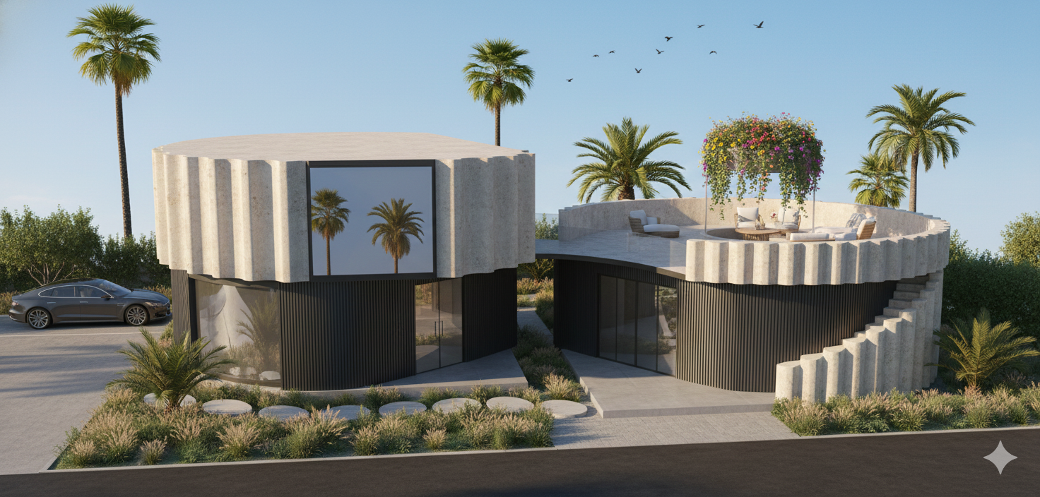 exterior shot using the first image as the exact geometric and camera reference render it into a fully realistic residential home that matches the material language lighting and realism of the second image maintain the same camera angle perspective proportions and massing as the first image do not rotate reframe or change viewpoint apply the same materials and finishes seen in the realistic reference ribbed concrete or stone cladding dark metal vertical fins at the lower level smooth curved upper volume realistic glass with reflections and subtle weathering set the project in los angeles with sunny clear skies warm afternoon light soft shadows and birds flying overhead add landscaping consistent with southern california low shrubs grasses palms include a modern car parked in the left parking lot only aligned with the site plan the building should read as a high end contemporary home photorealistic architectural visualization quality ultra detailed textures realistic scale natural lighting depth and atmosphere no abstraction no sketch lines no diagram colors photorealistic render only add glass rails to the brighe connecting both buildings