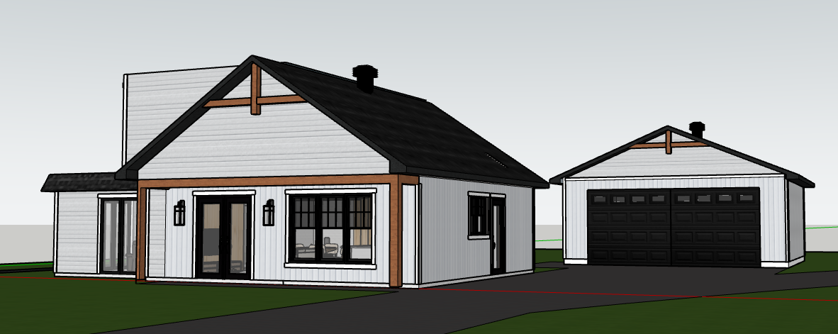 white residential vinyl siding black asphalt shingle roofing wood beam