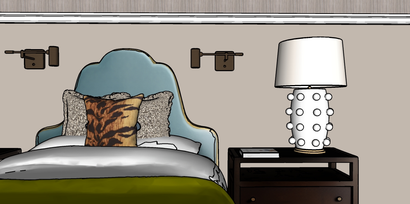 the headboard has a gold metal frame around the blue fabric the tiger print pillow is velvet the green blanket is an olive green cashmere blanket the nightstand is a dark brown grey wood with brass knobs add light coming from the left side window the lamp shade is pleated