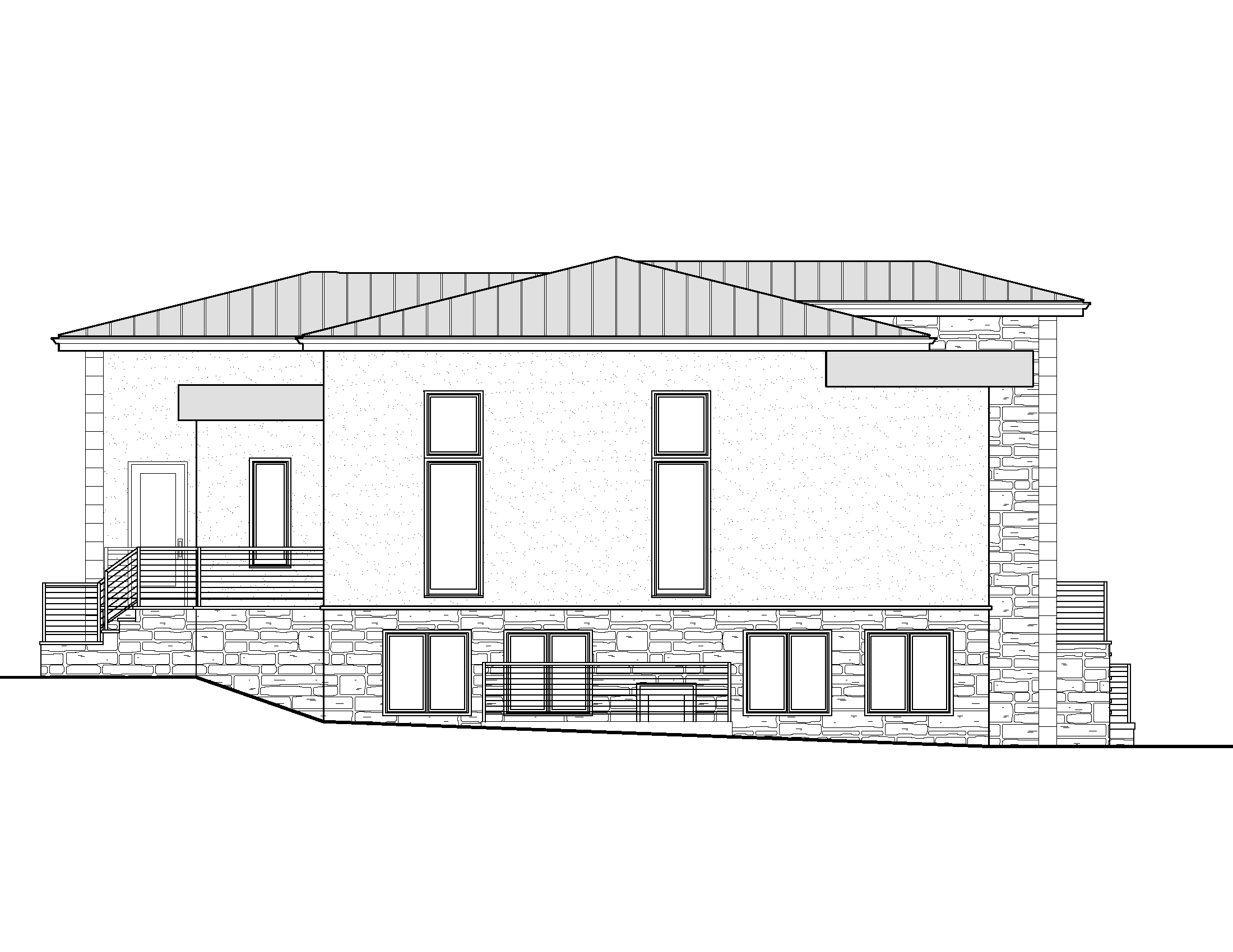 use the same colors and everything as the last render for this side elevation as well please render this residence as a modern home situated among large mature trees and small contemporary planting the house is mainly a light colored off white stucco with a similar light colored stone make it look realistic with grass in front of the building the exterior stair down to the basement is missing