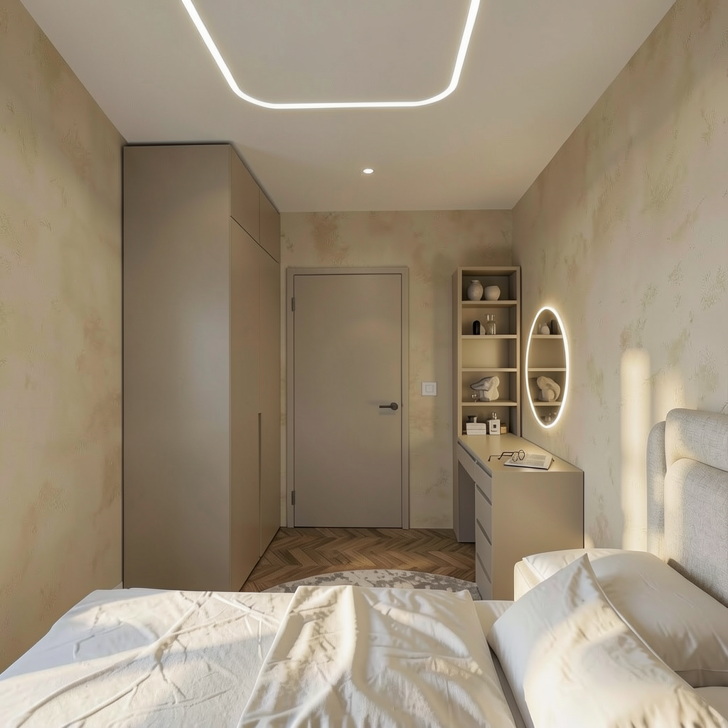 render a modern home interior based on the floor plan layout with an open and spacious atmosphere use a neutral color palette with soft whites and creams for the walls and ceilings incorporate natural wood tones for flooring in the living room and dining area adding warmth for the kitchen use sleek gray and white cabinetry with stainless steel appliances for a contemporary look in the bathroom implement light gray tiles for a clean and minimalist style choose deep navy for accent walls in the office for a modern touch ensure ample natural light streams through large windows creating a cozy yet elegant atmosphere throughout