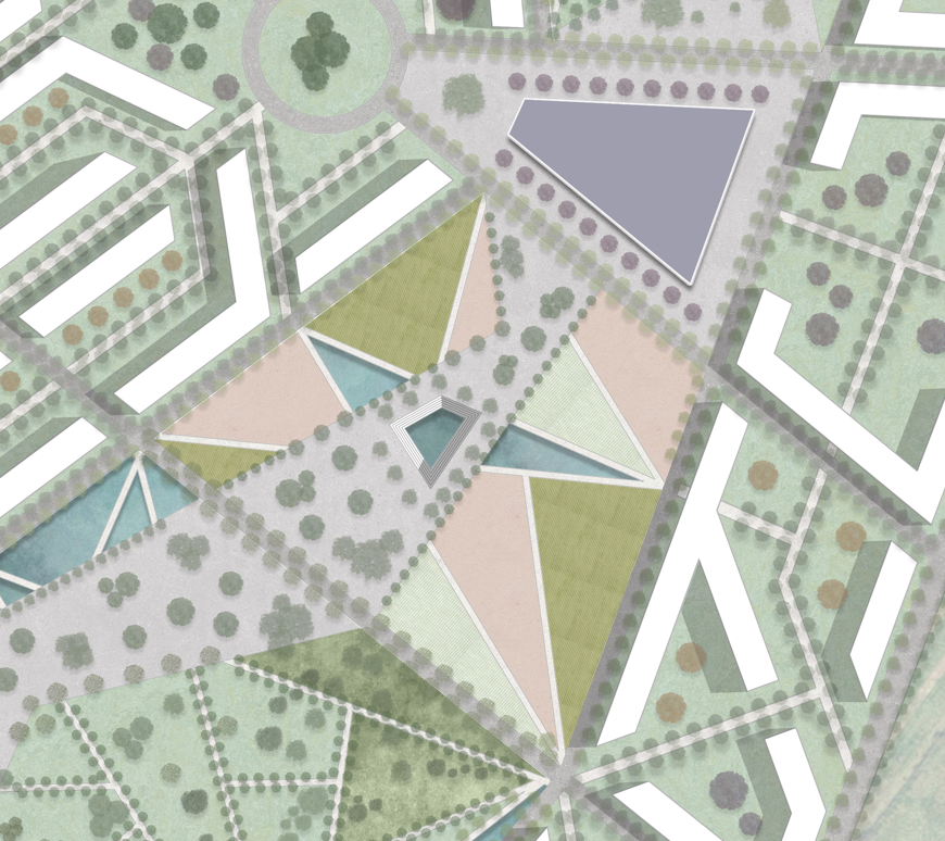 realizza un render realistico le parti in rosa e verde pi scuro sono degli orti urbani aggiungi arredo urbano come panchine lampioni e persone mantieni lo stesso assetto che vedi in pianta e gli stessi alberi