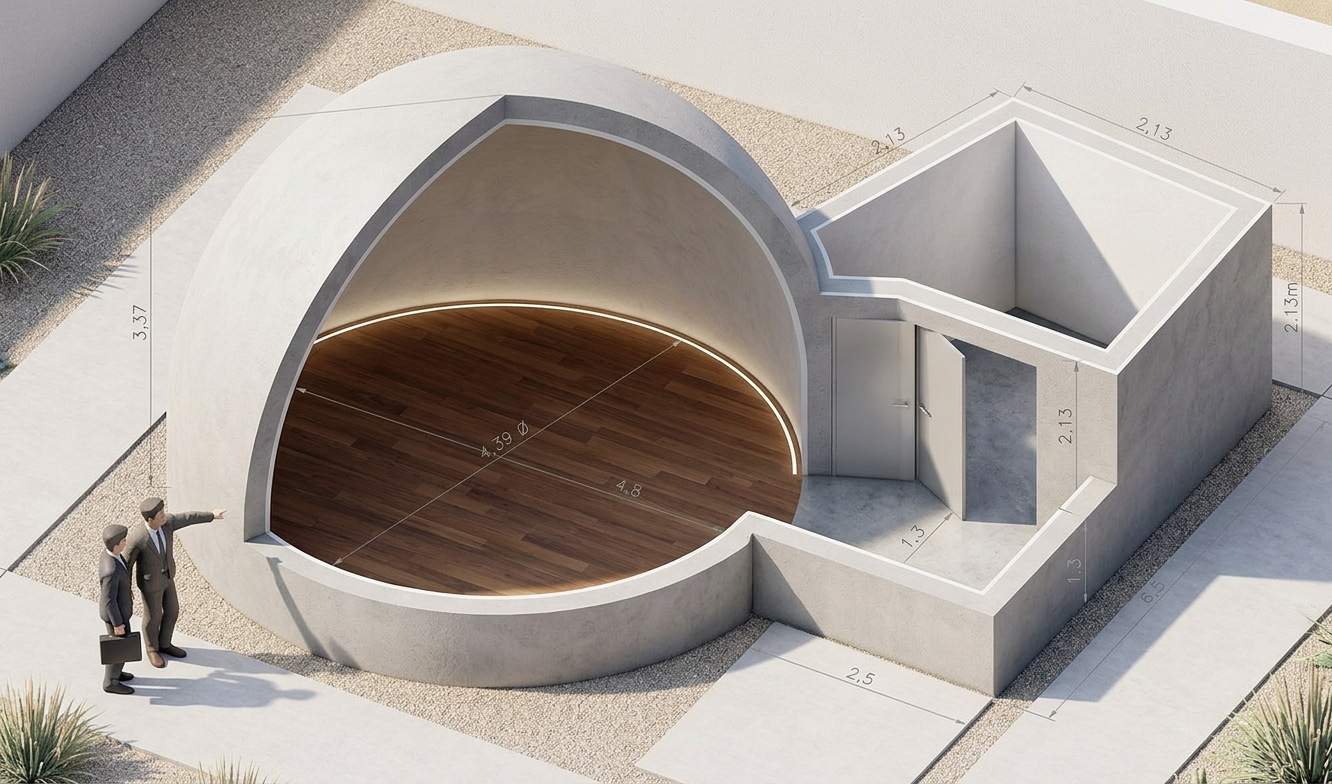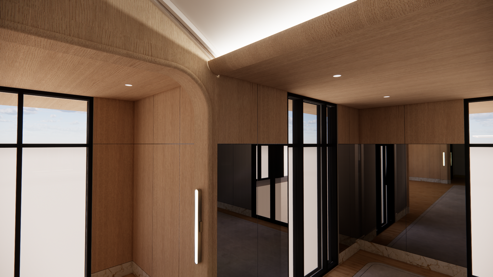 a spacious modern architectural interior with a minimalist design the walls are clad in elegant light wood paneling providing a warm and inviting atmosphere the ceiling features sleek curved white beams that subtly reflect natural light large windows with black frames let in an abundance of soft diffused daylight casting gentle shadows on the polished light grey concrete floor the overall palette is natural and calming with soft beige light brown and touches of white creating an airy and sophisticated space