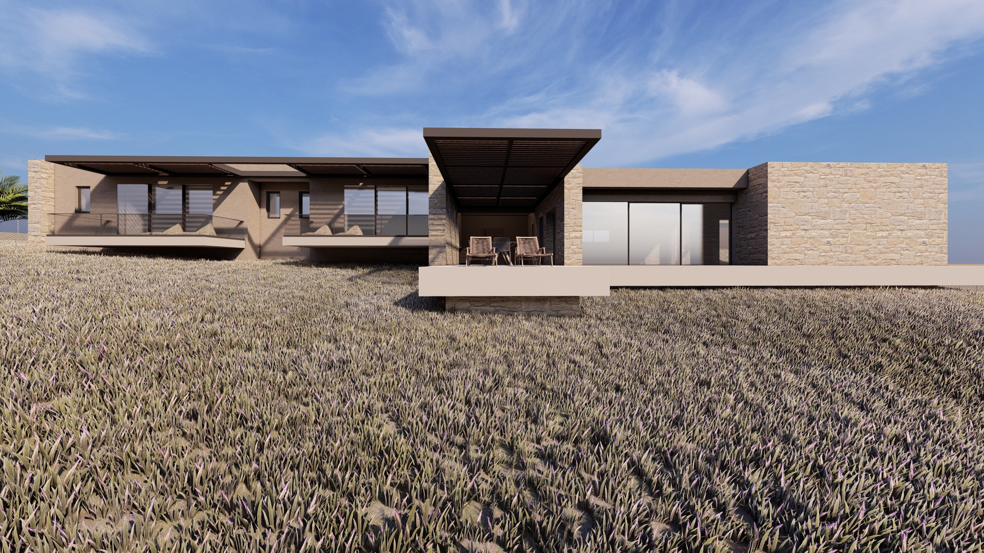 photorealistic nighttime architectural visualization of a vacation house designed for a person who loves surfing minimal and simple decoration relaxed coastal style subtle landscaping and soft ambient night lighting creating a calm seaside atmosphere the same materials as showed stone exactly as it is